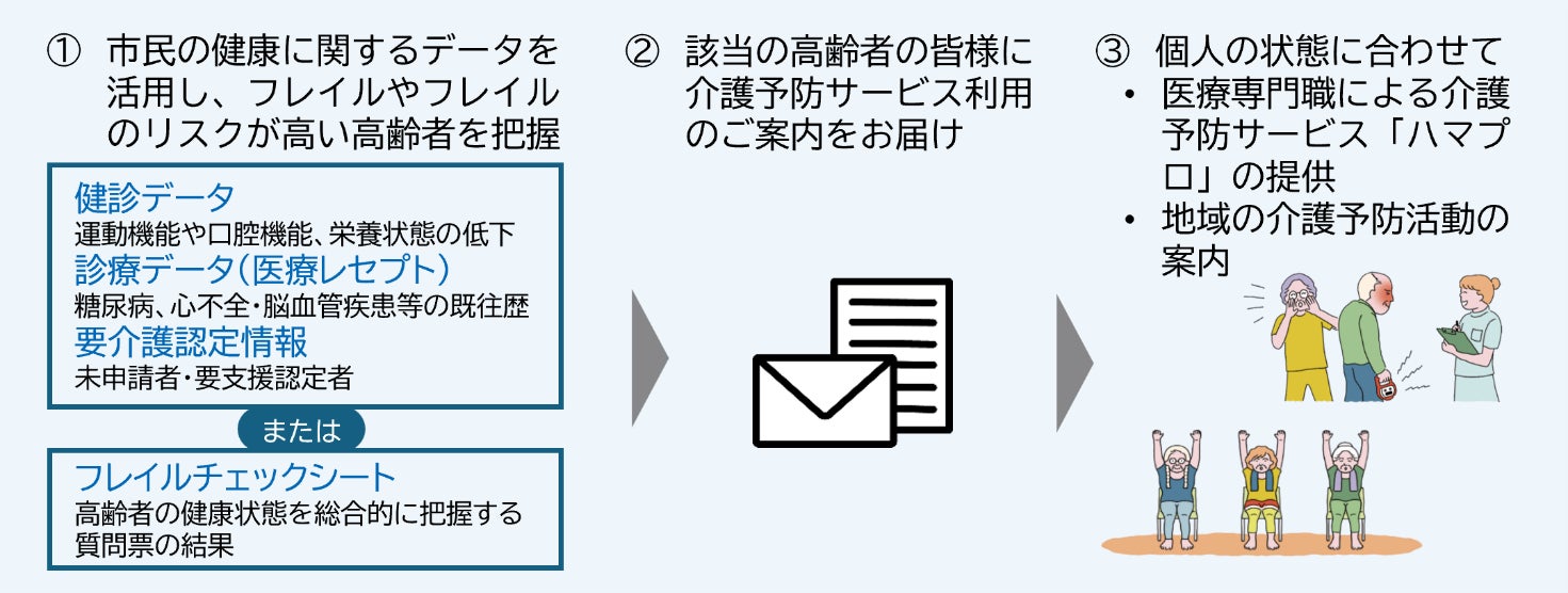 市民の健康に関するデータを活用し、フレイル等の高齢者を把握し、身体機能や栄養状態、口の機能の低下が心配される方に対して一人ひとりの健康課題に合わせた介護予防サービスを提供します。