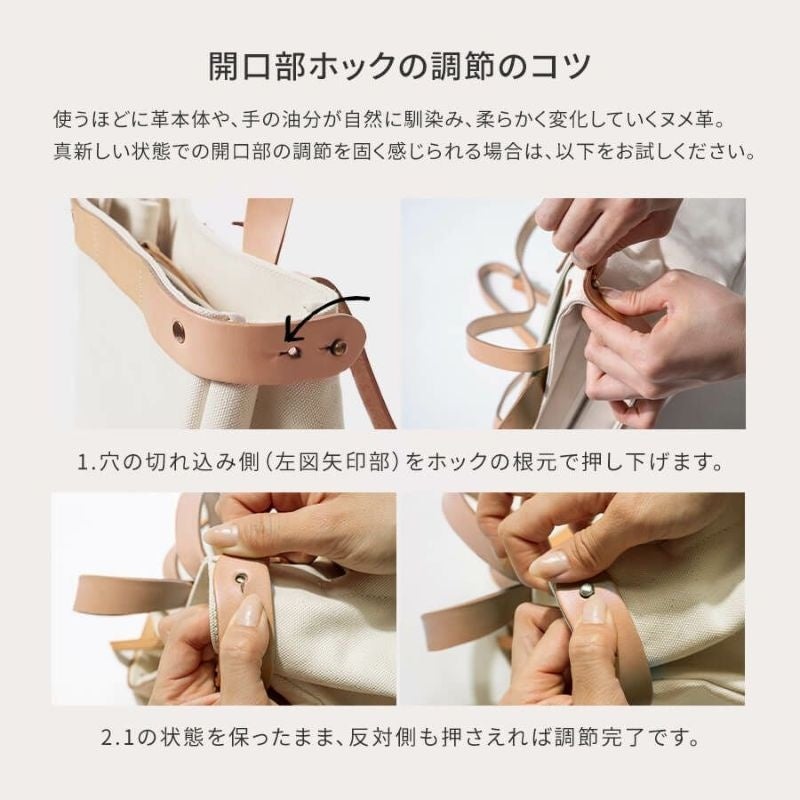 持ち手やショルダーにあしらったヌメ革は、少しずつ艶をまといながら飴色に変化し、ヌメ革本来の経年変化をお楽しみいただけます。