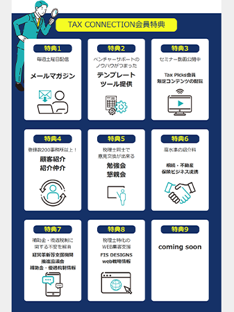 税理士事務所の経営に役立つ情報として、税理士業界トップクラスの30,000社超の起業家支援を通して培った経験や経営ノウハウをメールマガジンやセミナー動画、勉強会を通じて提供しています。また、顧客紹介や相続・不動産などの各種提携サービスもTAX CONNECTION会員の税理士に提供しています。