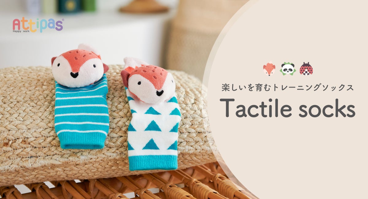 タクタイルソックスとは、「見てかわいい」「耳でも楽しい」、視覚、聴覚を刺激しながら楽しくトレーニングできるラトル付きソックスです。足裏にはすべて、アティパスのロゴの形の滑り止めがついています。パッと目を惹くデザインとパッケージで、出産祝いなど贈り物にもおすすめです。