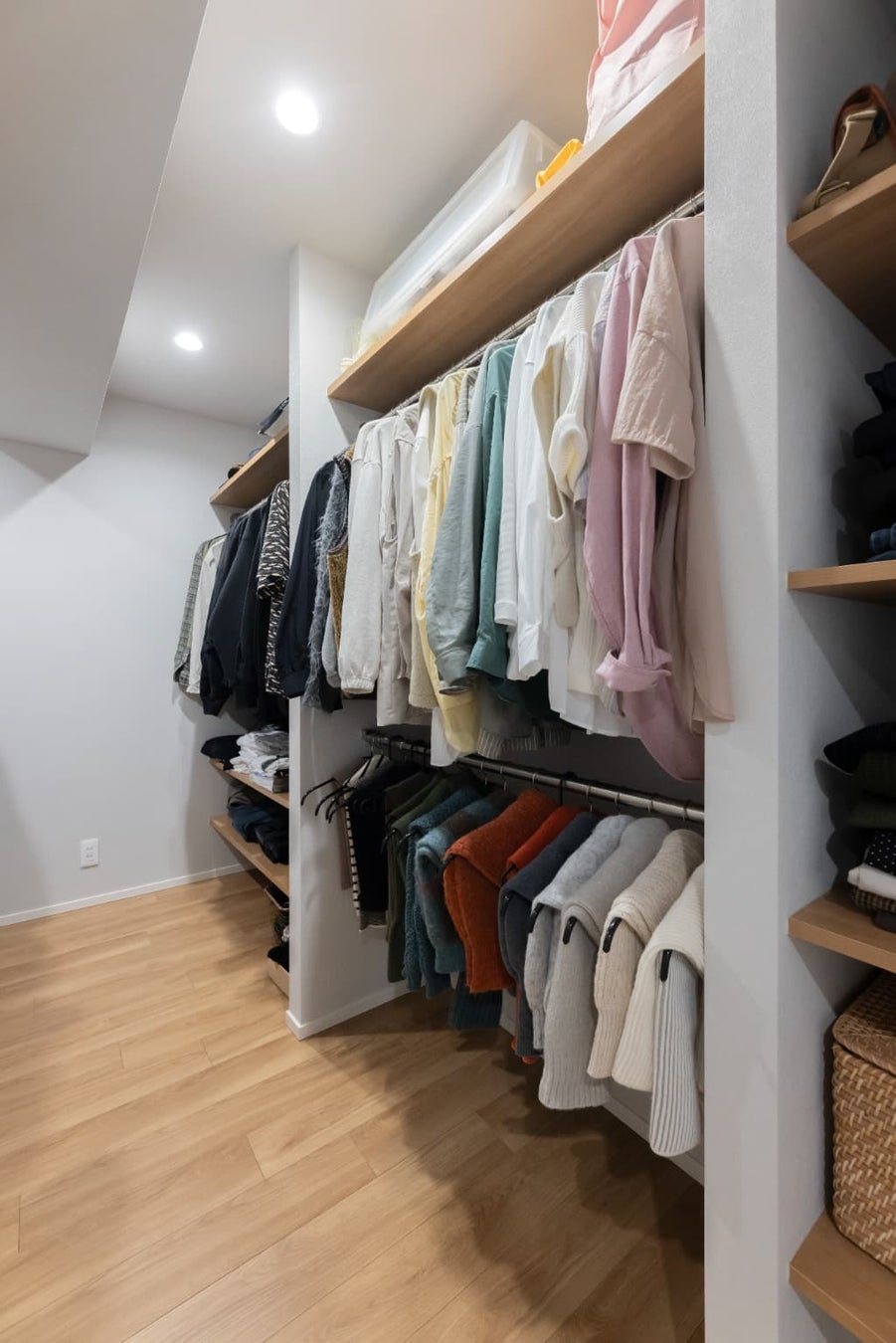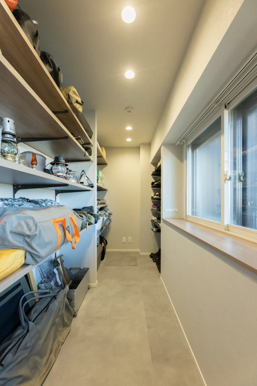 散らかりがちな日用品やアウトドア用品は土間収納やウォークインクローゼット、パントリーにしっかり収納。隠す収納を活用することで、生活感を感じさせないスッキリとした空間を実現しています。