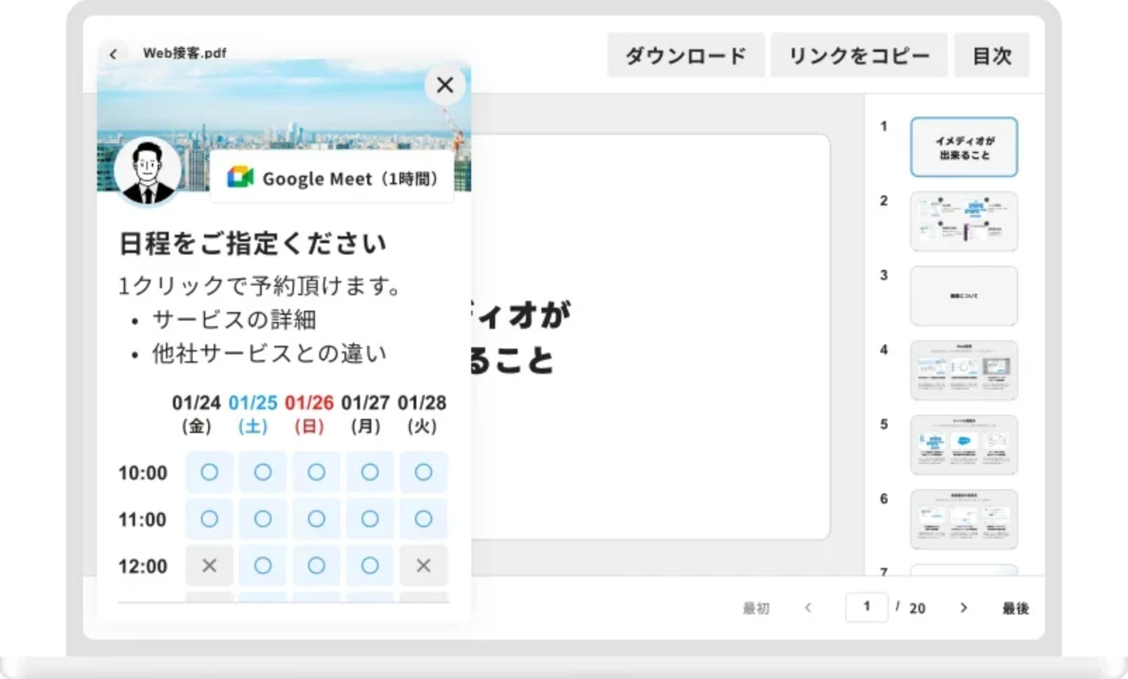 immedioは、ウェブサイト上で見込み顧客との商談調整を完結する、Web接客ツールを提供しています。私たちはテクノロジーの力で、サービスを作る側と探す側双方の体験を改善していきます。ビジネスの出会いから不効率を排除し、サービスを探す体験がもっと楽しくなる、サービスを作る側は価値の創出とデリバリーに専念できる、そんな社会を作っていくのが私達のミッションです。