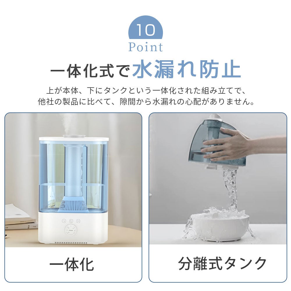 上蓋を開けることなくそのまま注げる仕様を採用。従来品はタンクと下部セットでの加湿器との比較、 本製品は一体型設計で、水漏れはありません。