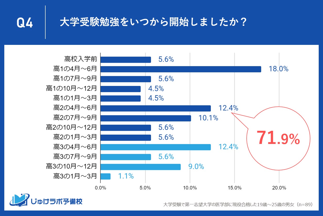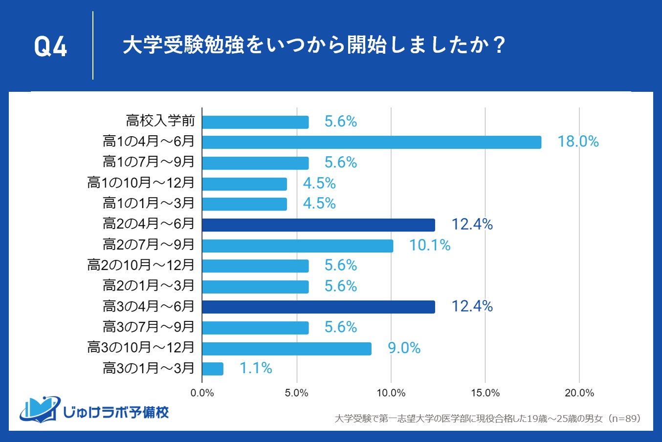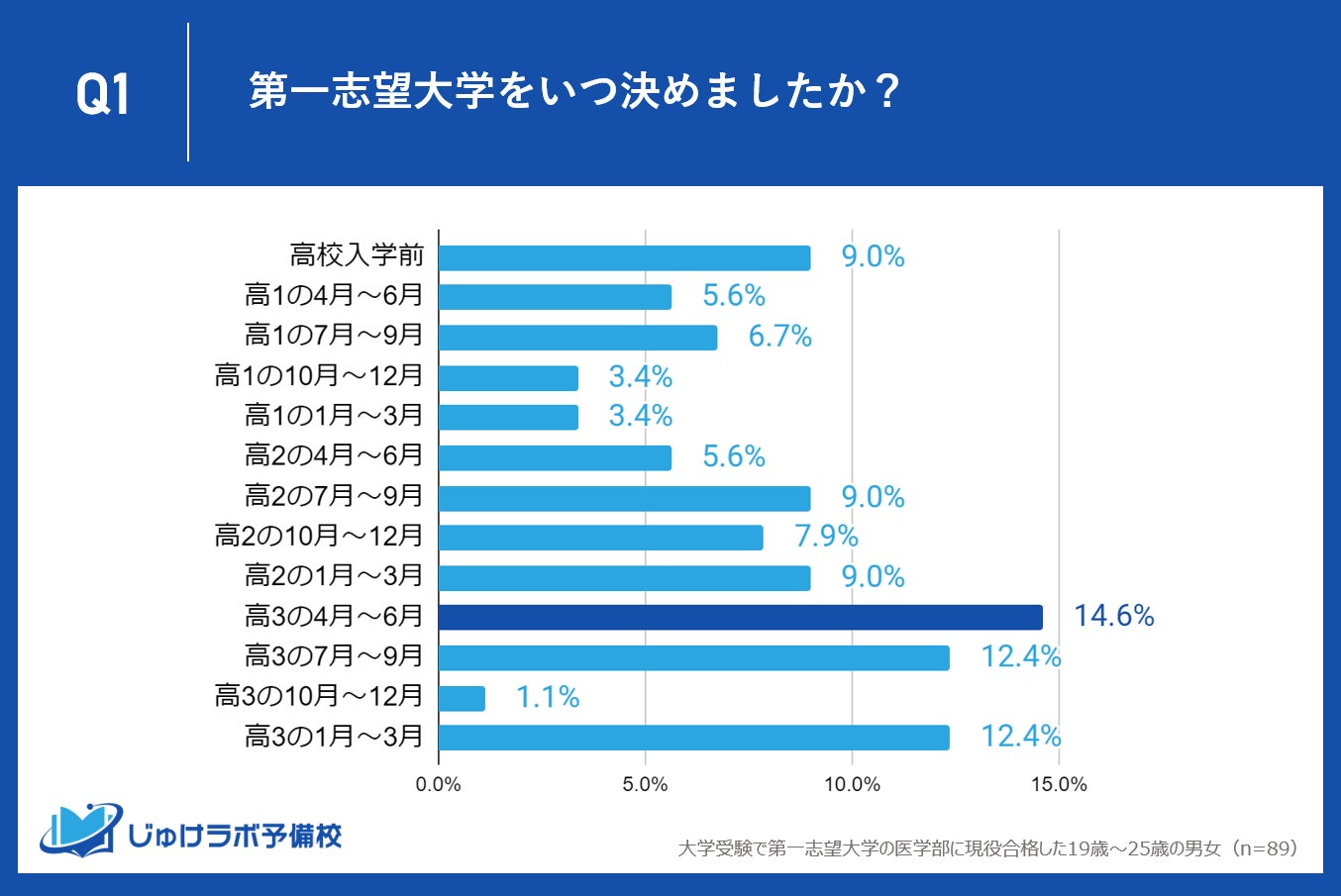 じゅけラボ予備校(所在地:大阪市北区、代表取締役:後藤智則)は、大学受験で第一志望大学医学部に現役合格した89名を対象に、志望校を決定した時期や受験勉強の開始時期に関する調査を実施しました。