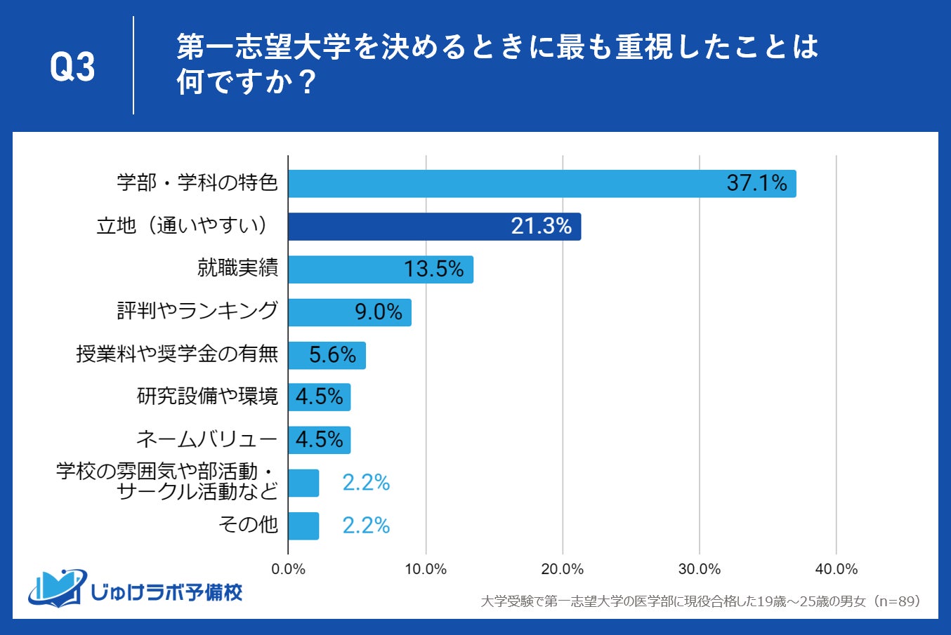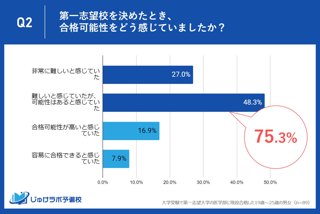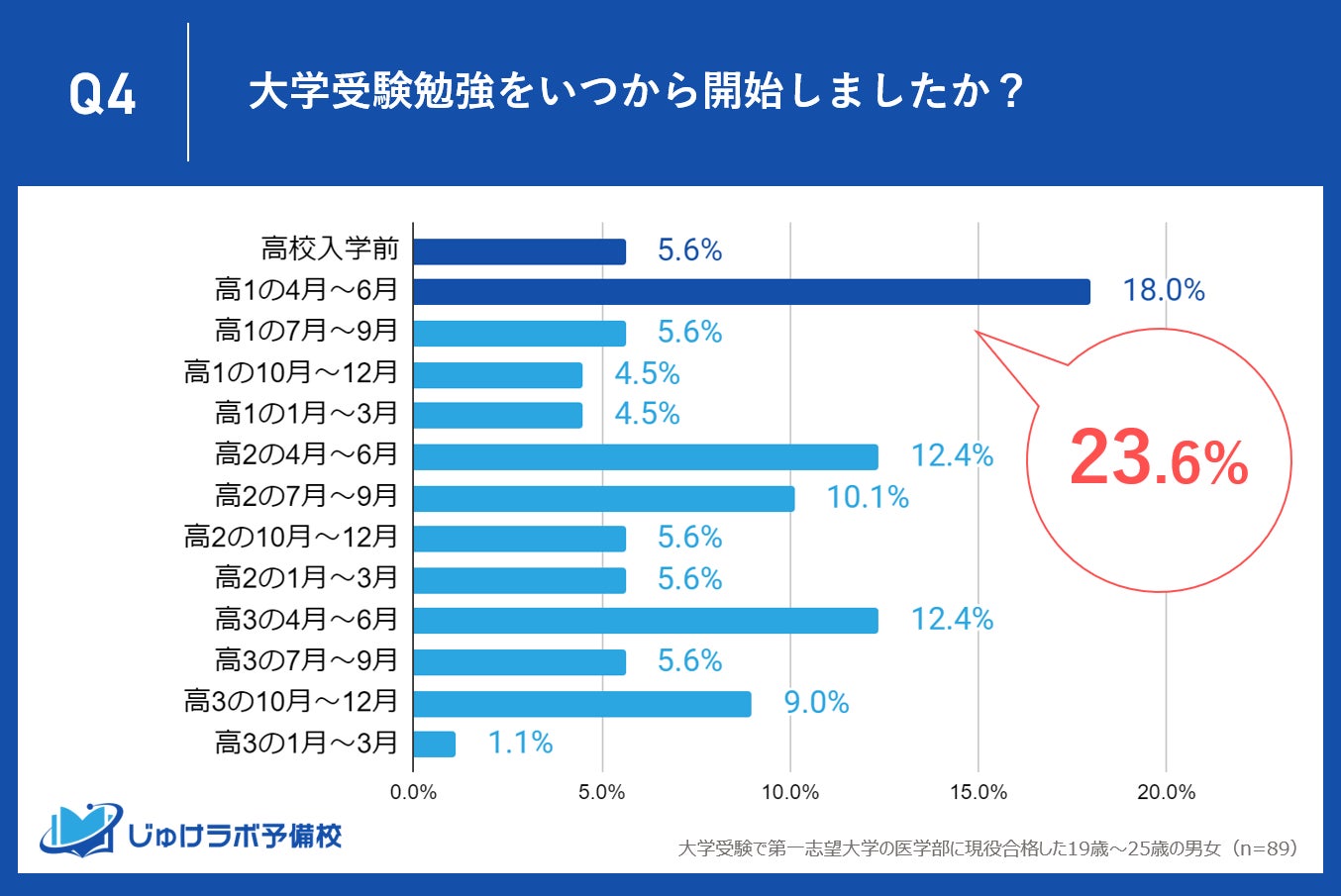 じゅけラボ予備校(所在地:大阪市北区、代表取締役:後藤智則)は、大学受験で第一志望大学医学部に現役合格した89名を対象に、志望校を決定した時期や受験勉強の開始時期に関する調査を実施しました。