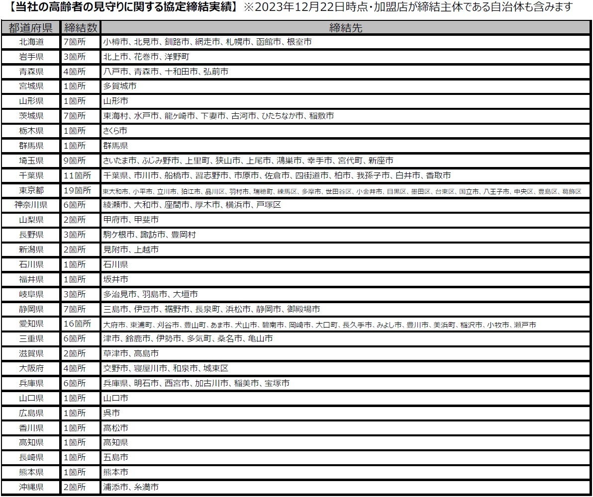 高齢者に密接な事業を展開する当社にとって、「高齢者の見守り」への取り組みは加盟店共々重要と考えています。今回の葛飾区との協定締結をはじめ、今後も各自治体等との連携を図りながら「すべてはご高齢者の為に」という想いの具現化に向けて、加盟店と一体となって取り組んでまいります。