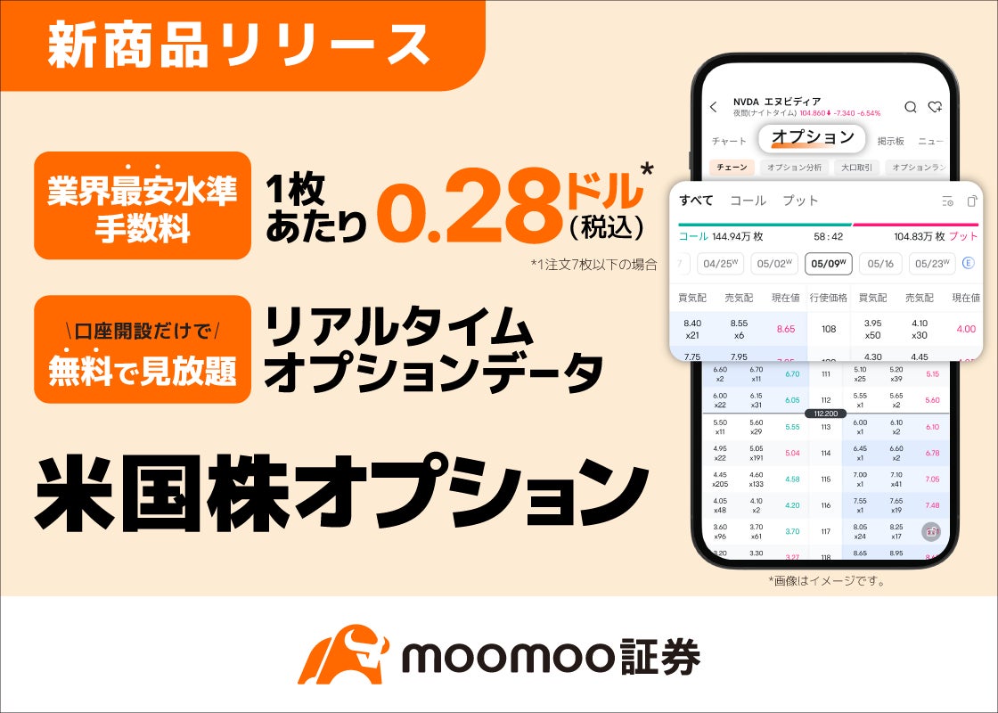 国内でアプリダウンロード数150万件(※3)を突破したmoomoo証券株式会社(ムームー、本社:東京都渋谷区、代表取締役社長:伊澤フランシスコ、以下「moomoo証券」)はこの度、米国株式のオプション取引サービスを新たに開始いたしました。オプションの取引データをリアルタイムに無料で見られて、ネット証券で業界最安水準(※1)の手数料を実現しつつ、取引可能銘柄数も業界最多水準(※2)の6,000銘柄以上でご提供いたします。