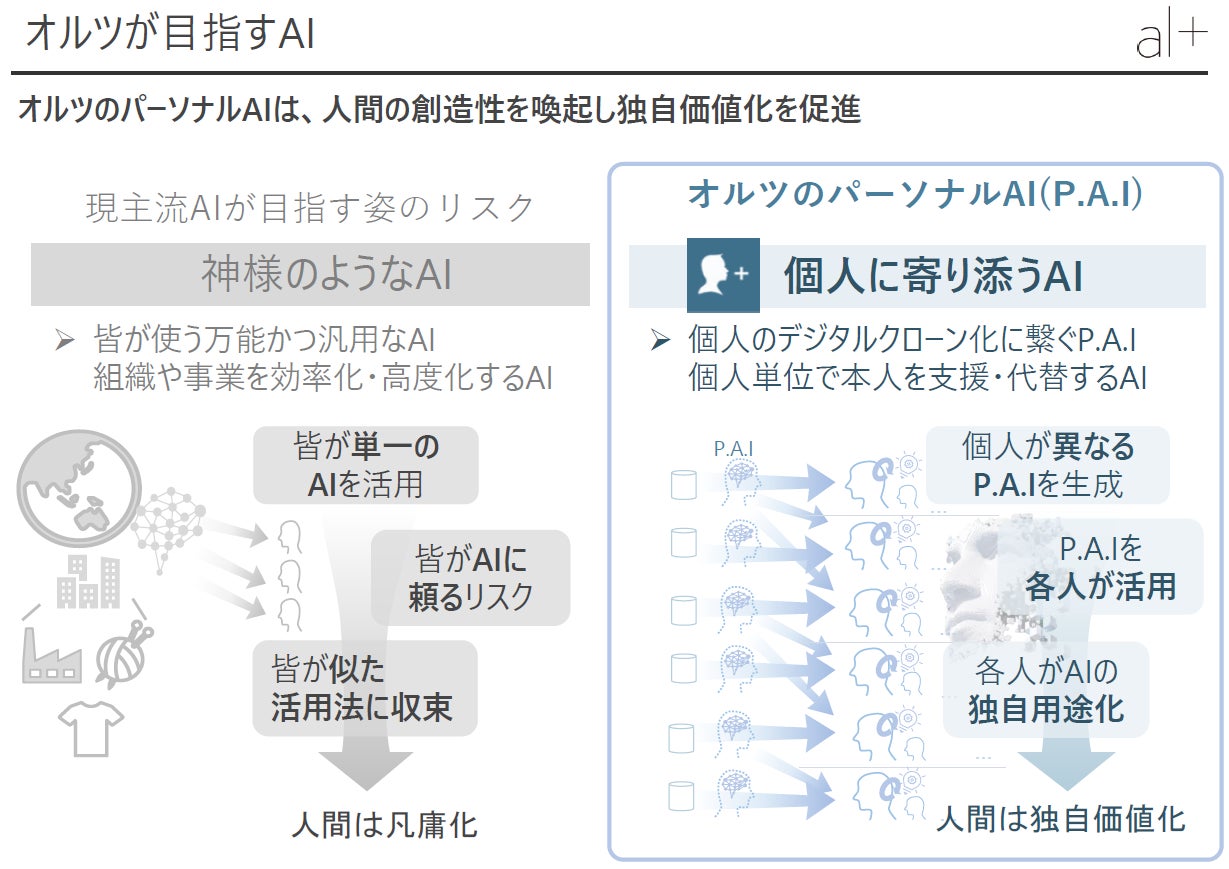 オルツは引き続き、当社のビジョンである「1人1つのパーソナル人工知能(One P.A.I.)」ならびに「ラボーロ(労役)からオペラ(アーティスティックな営み)へ」の実現に向け、AI技術の研究・開発に邁進するとともに、政府や公共機関との活発な議論を継続し、日本のAI技術発展への貢献と、AIフレンドリーなより良いデジタル社会の実現を目指して参ります。