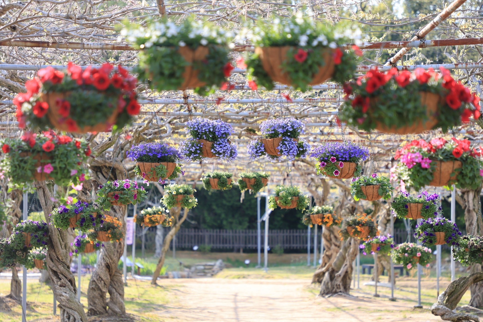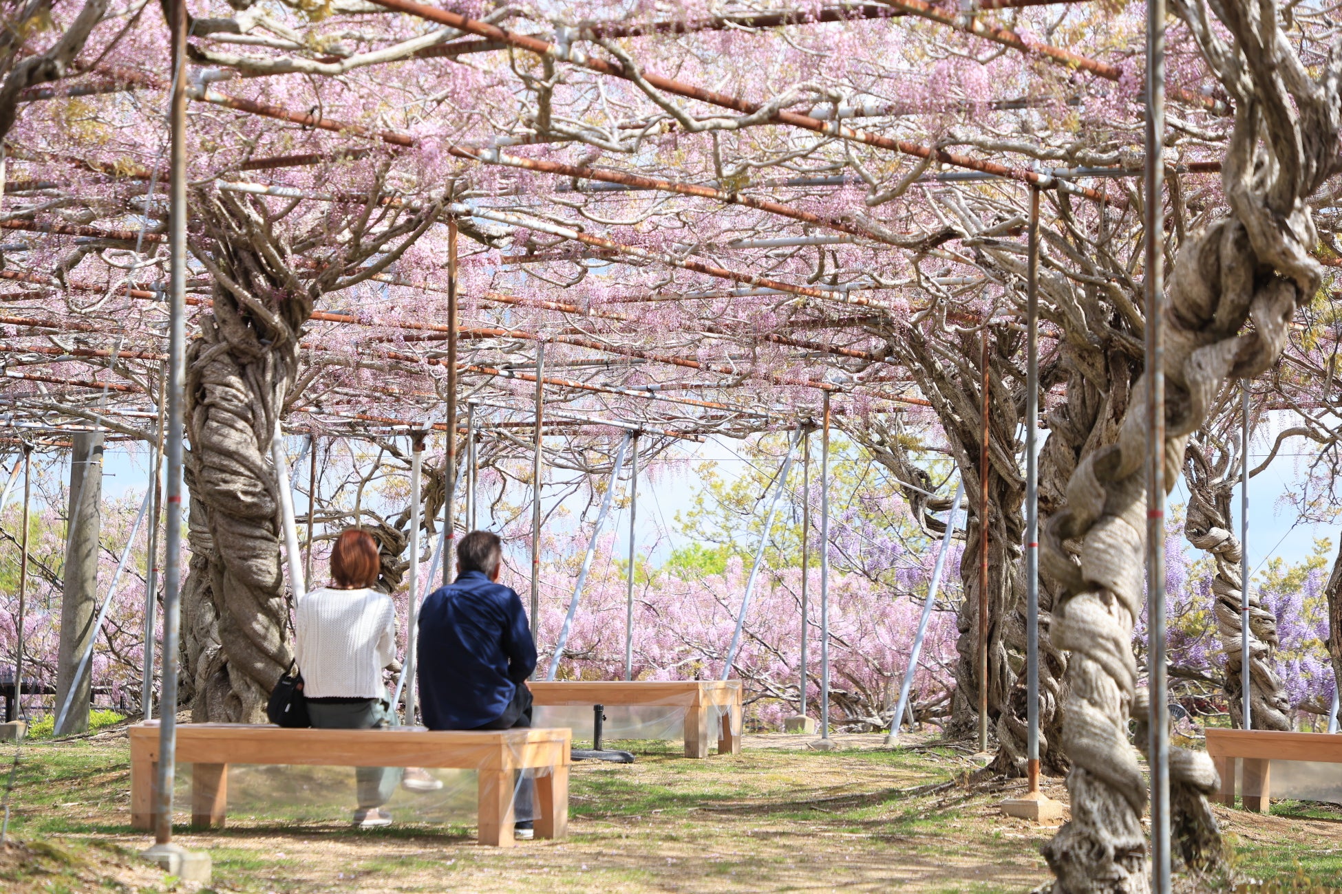 30,000㎡に約1,000本の藤と、昇り藤という別名のあるルピナス12,000株が花開きます。柔らかな藤色に包まれた園内で、ゆったりとした優しい時の流れを感じてください。