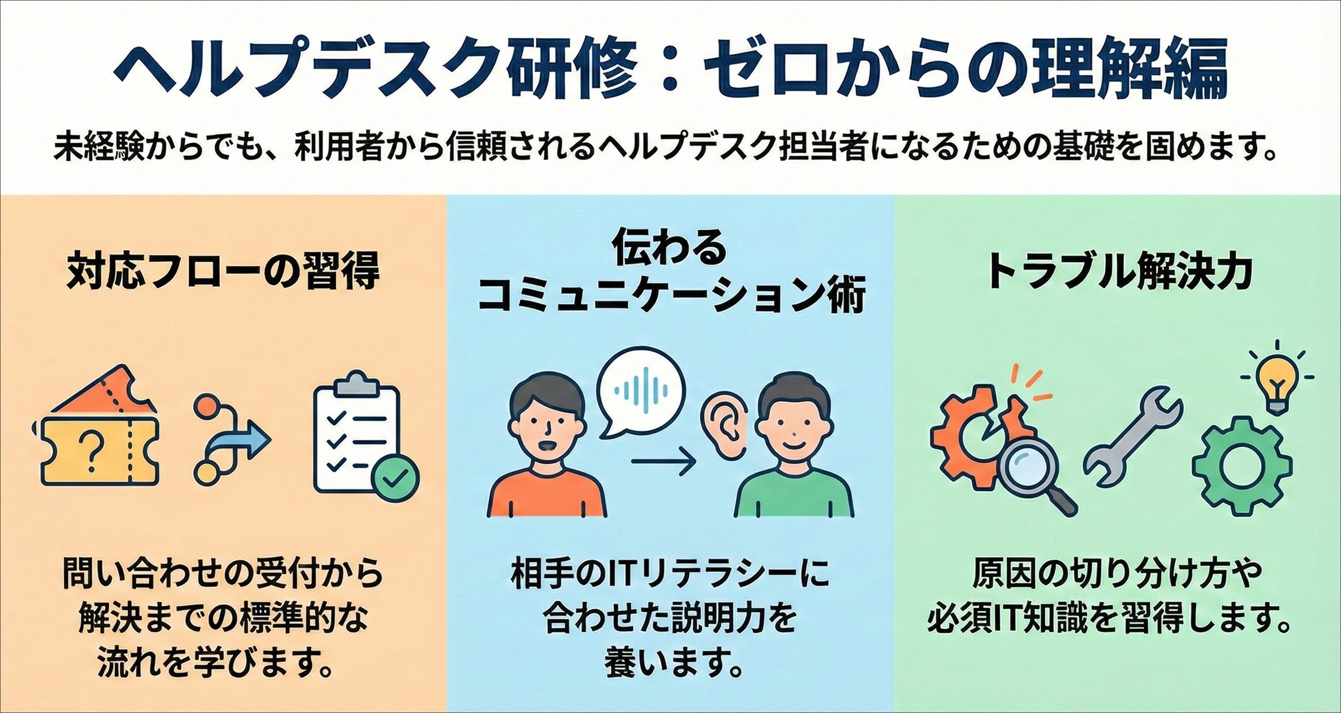 ヘルプデスクの役割理解からチケット管理、トラブルシューティング、IT基礎知識までを網羅し、円滑な問い合わせ対応を支援します。