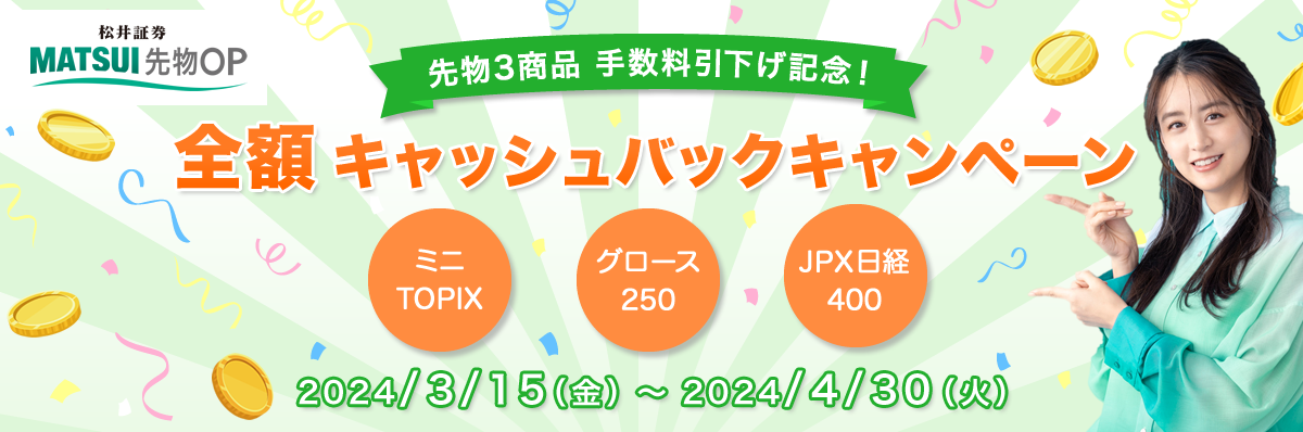 今回の先物3銘柄における手数料引下げを記念し、2024年3月15日(金)夜間立会~4月30日(火)日中立会までの先物3商品の取引手数料について、全額キャッシュバックするキャンペーンを実施します。