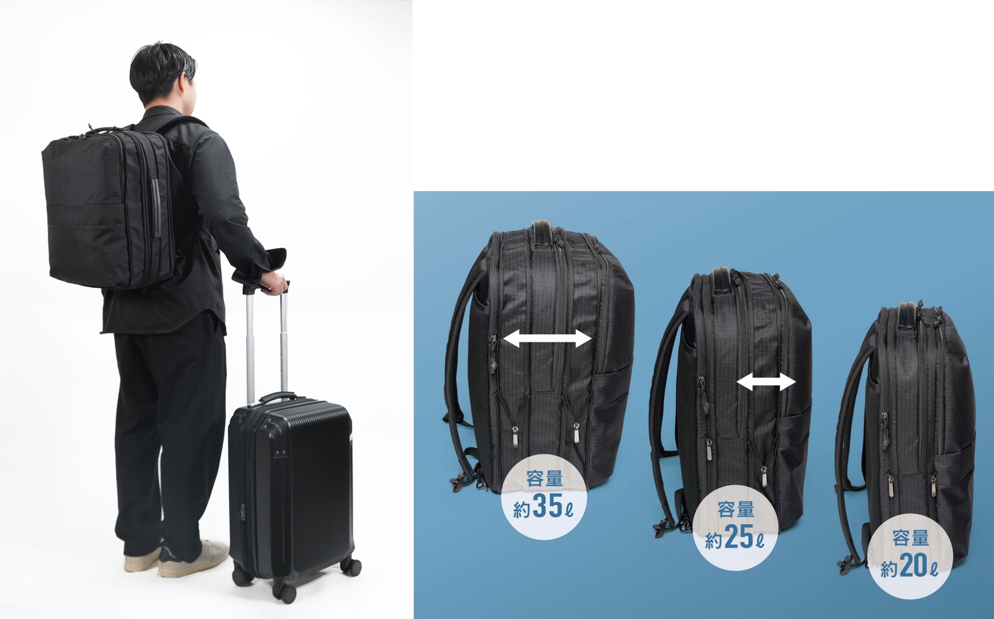 昨今、働き方が多様化しビジネススタイルのカジュアル化や出張など外出する機会が増えている中、ビジネスリュックのニーズが高まっています。そこで、通勤から荷物が増える商談や2~3泊の出張まで、1つのバッグで対応できるビジネスリュック「すごバッグ」を企画。バッグ&ラゲージメーカー「エース」と共同開発することで、ビジネスパーソンにとって便利な機能を搭載しました。今回のリュックは、通常時の容量約20ℓから側面の2箇所に設置したファスナーによりマチ幅が広がり、約25ℓ・35ℓと2段階で容量が拡張するダブルエキスパンダブル機能を備えています。これはエースと当社にとって初の試みで、最大容量は機内持ち込みサイズ※のキャリーケースと同等です。また、スーツやビジネスカジュアルにも合わせやすいシンプルなスクエア型デザインで、手提げバッグにもなる2WAY仕様となっています。