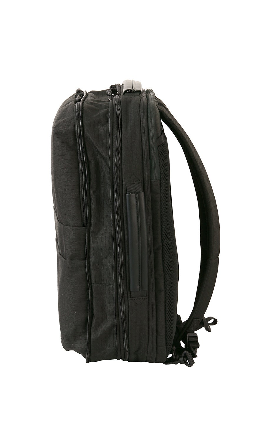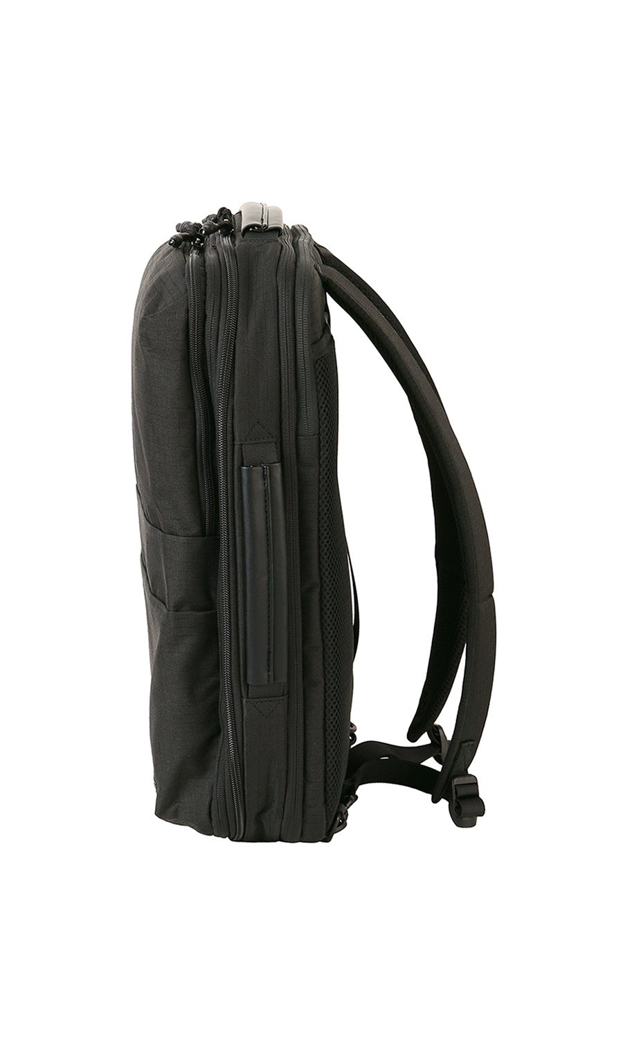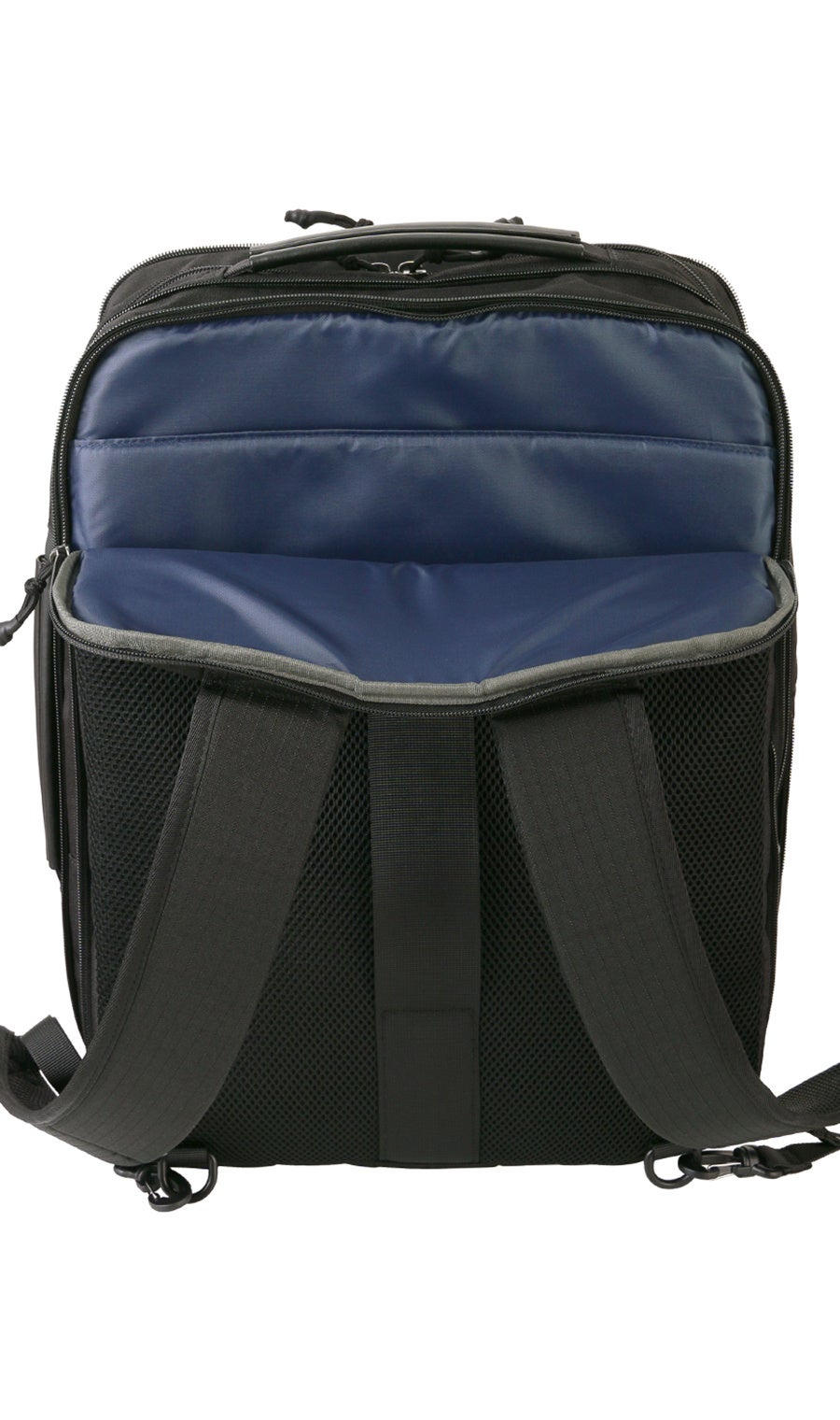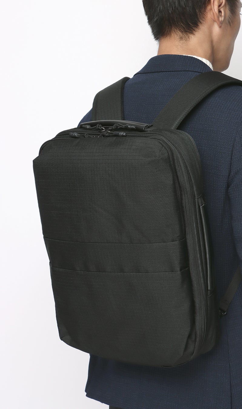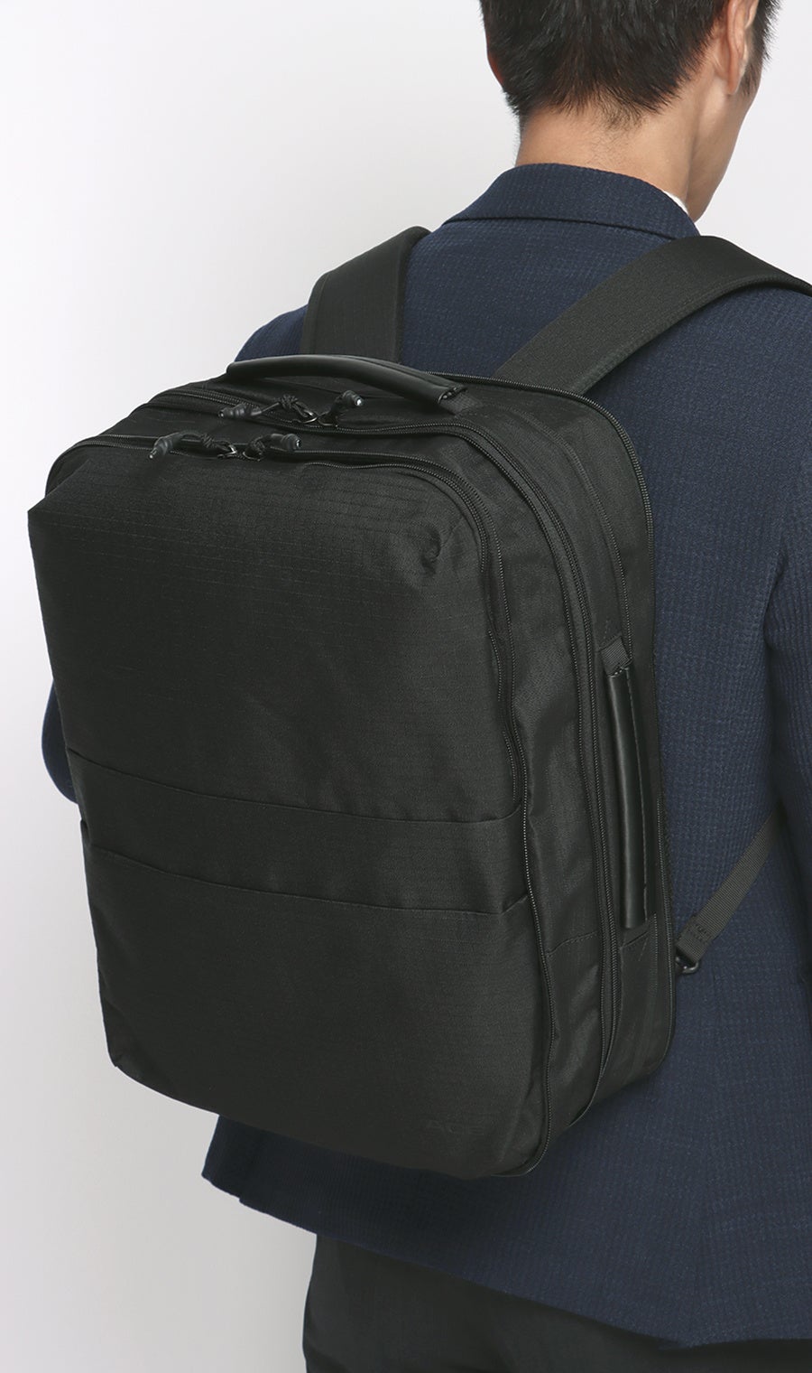 ビジネスシーンにあうシンプルなスクエア型。リュックとしてだけでなく、手提げバッグとしても使用できる2WAY仕様。また、15.6インチに対応したクッション性のあるPC収納のファスナーには水が浸入しにくいコーティングタイプを採用。