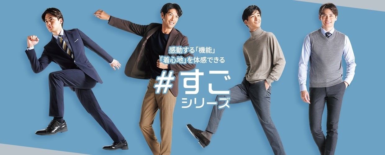 当社商品の機能性の高さを訴求する「#すご」シリーズ。ジャケットやスラックス、セーターなどの各アイテムにお客様からの要望が多い機能を備え、着心地やコスパの高さを打ち出した商品シリーズです。