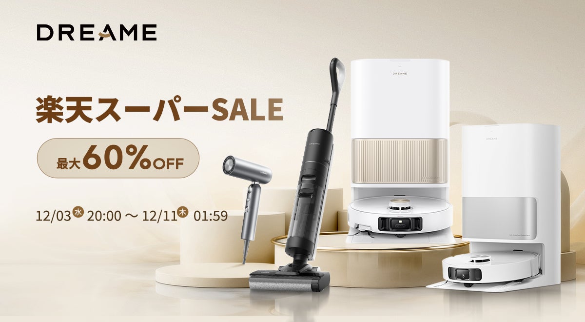 高速デジタルモーターで世界トップクラスの性能を誇るスマート家電総合メーカー、Dreame Technology Japan株式会社(ドリーミーテクノロジージャパン、本社:東京都中央区)は、2025年12月3日(水)20時から12月11日(木)01時59分まで開催される年末「楽天スーパーSALE」において、Dreame日本公式楽天市場店にてロボット掃除機および水拭き掃除機、速乾ヘアドライヤーの特別セールを実施します。