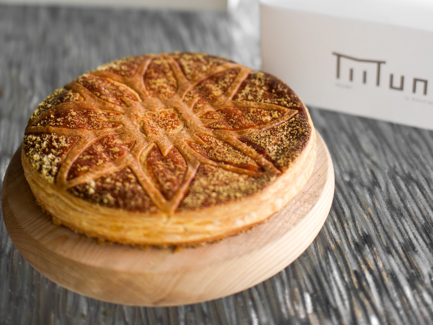 フランスの新年を祝う象徴的な伝統菓子「ガレット・デ・ロワ」。MUNI LA BOUTIQUEでは、フランスの伝統に敬意を払いながらも、日本の繊細な美意識を融合したオリジナル ガレット・デ・ロワを販売いたします。日本の伝統的な切り紙細工を思わせるデザインが施され、まるでアーモンドの花が開くような優美さを感じさせる、見た目にも美しいスイーツです。一口頬張ると、サクサクのパイ生地と甘いトッピングに包まれたなめらかなアーモンドクリームが口の中に広がり、絶妙な味わいを生み出します。
