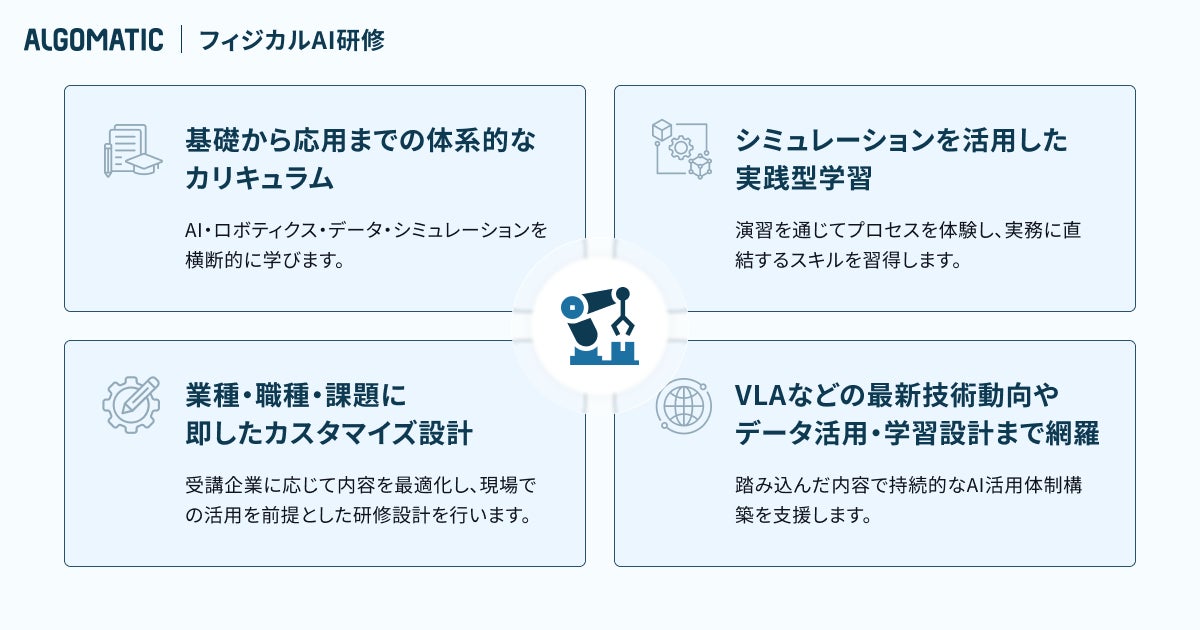 株式会社Algomatic(本社:東京都港区、代表取締役:大野 峻典、以下Algomatic)は、2026年2月26日、フィジカルAI人材育成のためのプログラム『フィジカルAI研修』を提供開始したことをお知らせいたします。本研修は、製造業をはじめとする現場主導型の企業において、AI・データ・ロボティクスを統合的に活用できる人材の育成を目的としており、AI変革人材育成のための実務直結型プログラム『Algomatic AI Academy』内で新たに提供を開始するプログラムです。