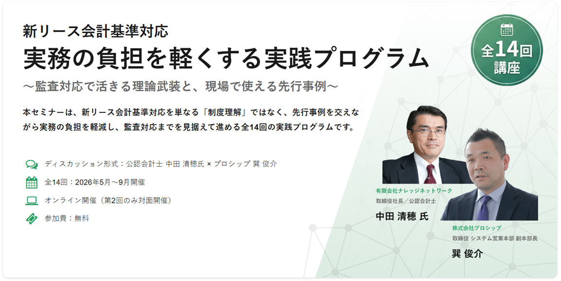 株式会社プロシップ(本社:東京都千代田区、代表取締役社長:鈴木 資史)は、2027年4月からの新リース会計基準適用に向けた全14回の無料オンライン講座「新リース会計基準対応|実務の負担を軽くする実践プログラム」を始動いたします。 その第1回目となるセミナー『【識別】契約書のどこを読み、どう「狭く」定義するか』を、2026年5月14日(木)にオンラインにて開催することをお知らせいたします。