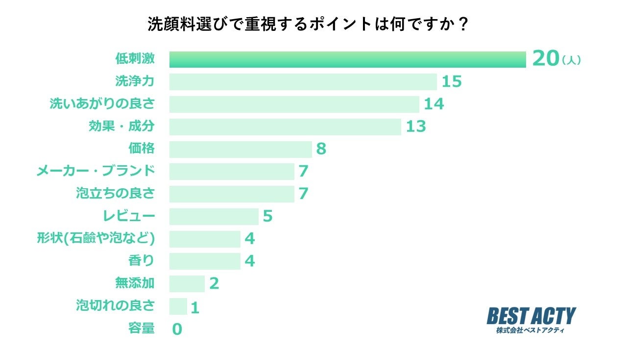 洗顔料選びで重視するポイントについて100人にアンケートを行ったところ、「低刺激」と回答する人が最も多い結果となりました。