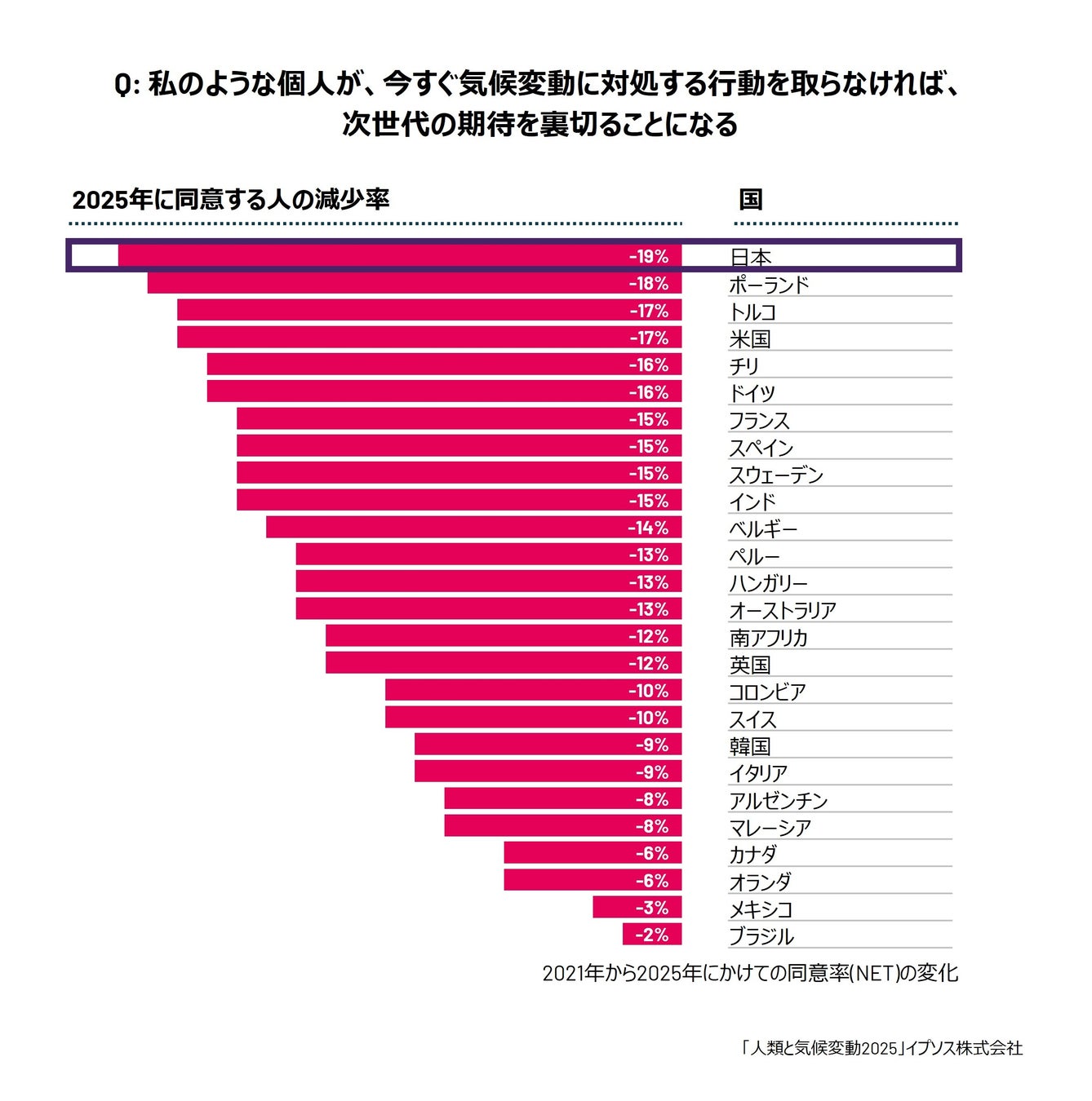 調査では「個人が今すぐ気候変動に対処する行動を取らなければ、次世代の期待を裏切ることになる」という問いに対し、日本で同意したのは40%にとどまり、32か国中最下位でした。(グラフ1)さらに、この質問への同意率は2021年から2025年にかけて減少傾向にあり、日本では19%の減少と最も大きな変化が見られました。(グラフ2)