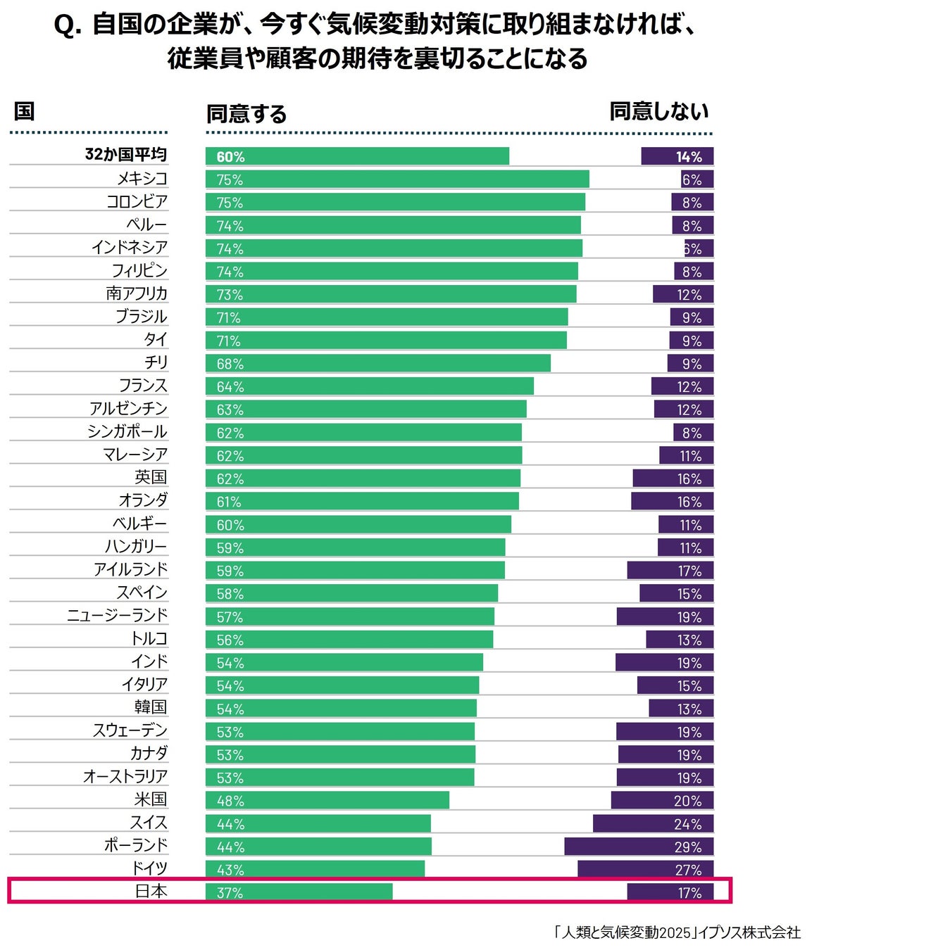 日本は、政府や企業の気候変動対策への取り組みに関する意識も低く、以下の2つの質問において、32か国中最も同意率が低い結果になりました。