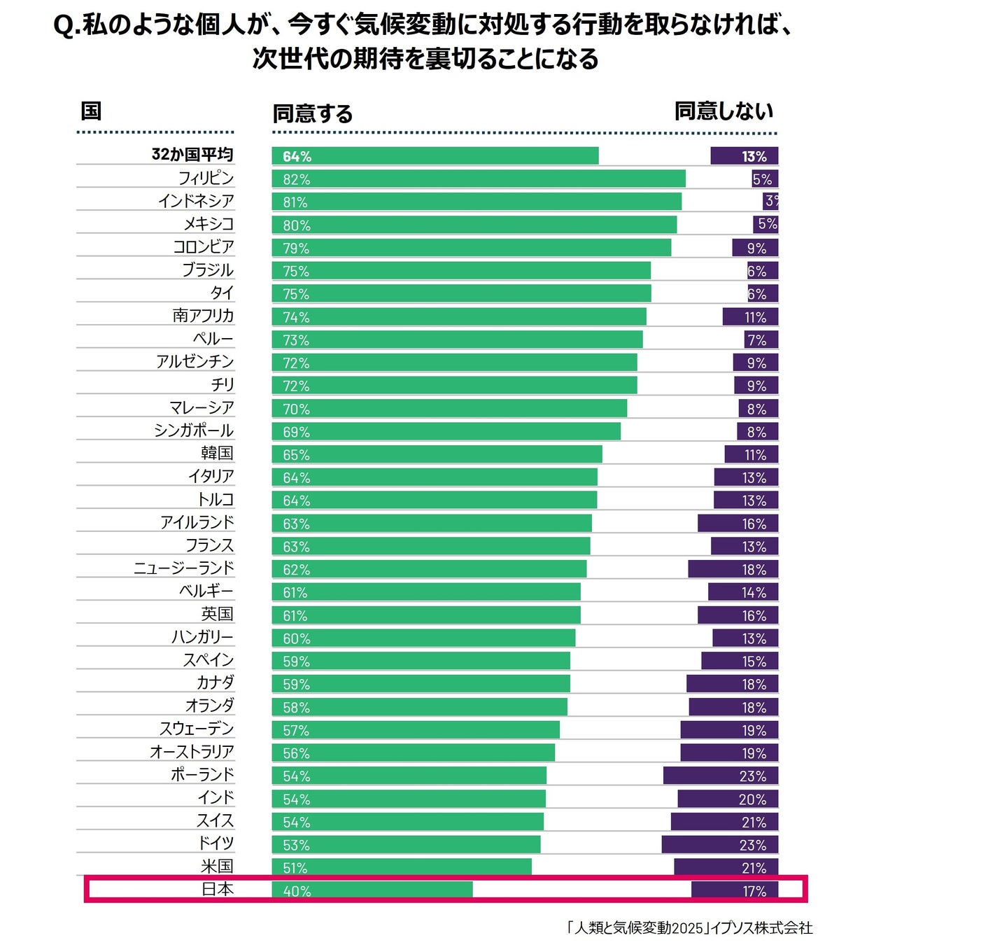 世界最大規模の世論調査会社イプソス株式会社(日本オフィス所在地:東京都港区、代表取締役:内田俊一)は、4月22日のアースデイに向けて実施した32か国調査「人類と気候変動レポート 2025」の結果を発表しました。この調査では、気候危機により私たちが直面するリスクに対する認識や、さらなる行動に対する責任の所在について明らかにされています。その中で日本人の気候変動対策への意識が著しく低下していることが明らかとなりました。詳細のレポートはこちらからご確認ください。