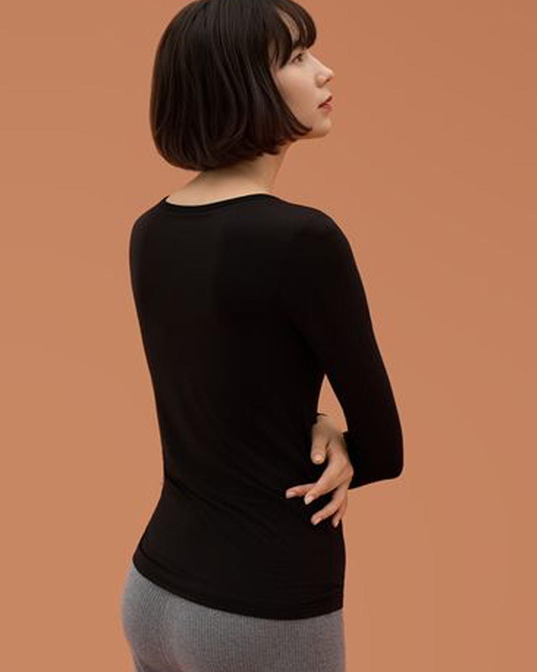 今回開発した特許取得(*1) の最新技術によって『バンビウォーター ブライン スーパーヒート インナー クルーネック』を1枚着用するだけでバストを高い位置にキープするため、快適さだけでなく理想のシルエットも実現しました。さらに従来のヒートインナーの弱点だった“厚み”と“ムレ”を解消。