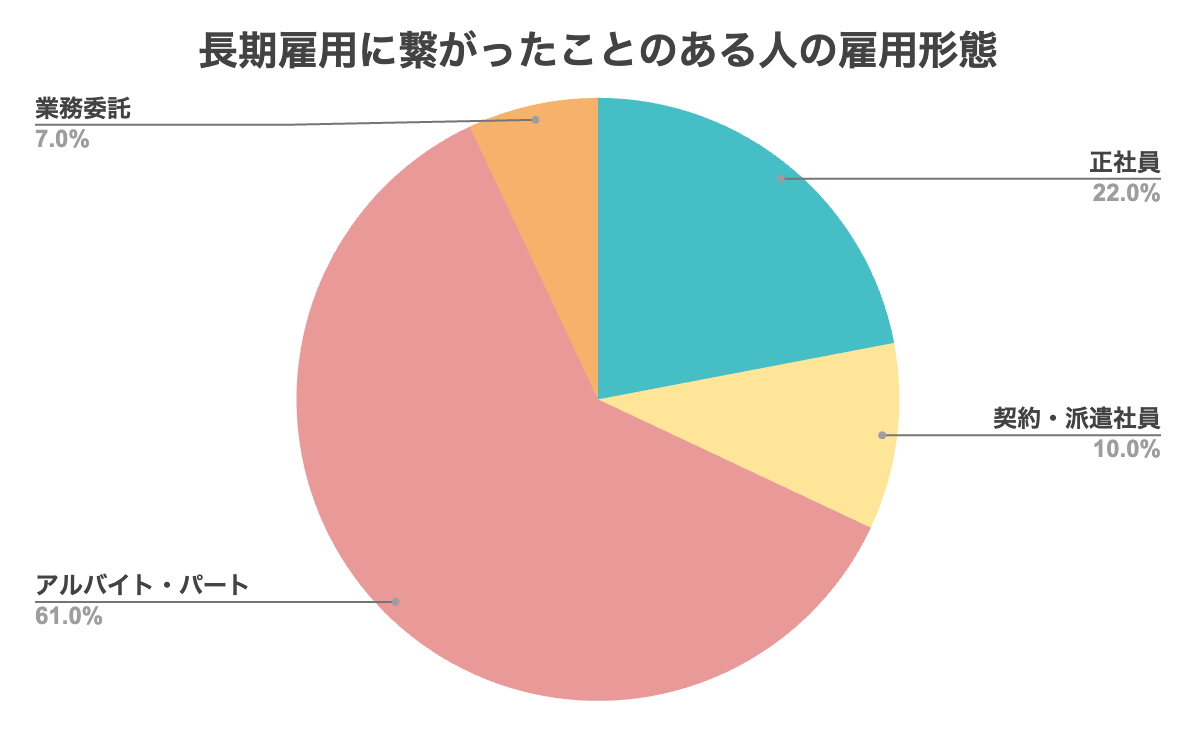 「はい」と答えた人の属性は男女比での大きな差はみられませんでした。長期就業に繋がったことがあると回答したユーザーの雇用形態を見ると、アルバイト・パートに限らず正社員として雇用されたユーザーもいることがわかります。