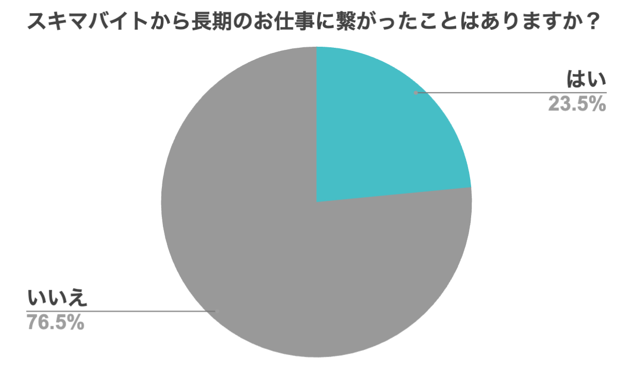 回答があったスキマバイト経験があるユーザーのうち、スキマバイトから長期就業につながったことがあるユーザーは23.5%と、2023年に実施した実態調査アンケートに続き2割以上が長期就業につながっているということがわかります。