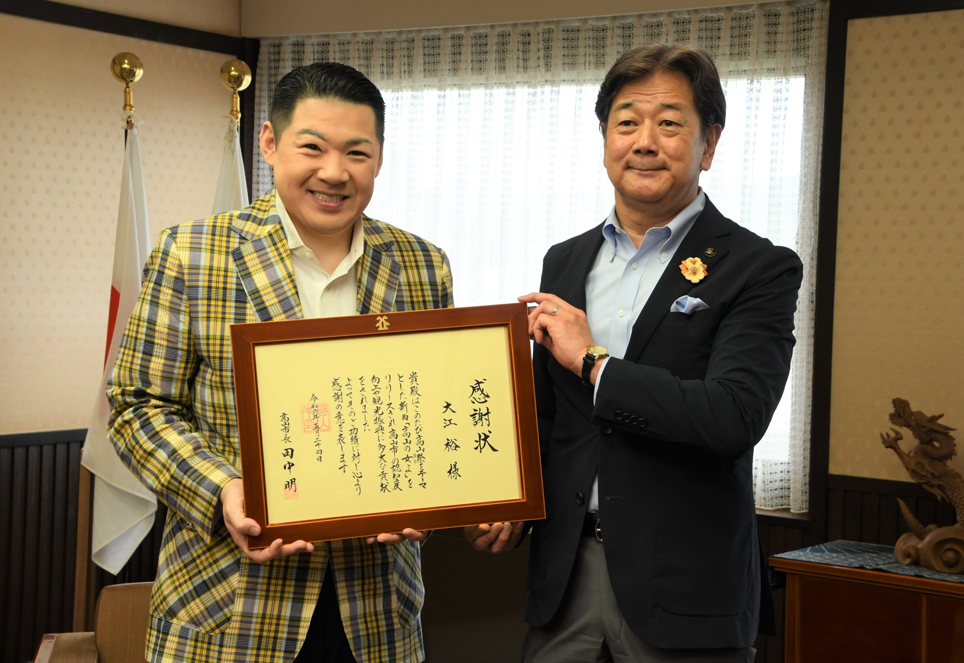 北島三郎氏を師匠に持つ演歌歌手の大江裕さんが、令和6年2月14日に、高山祭をテーマとした新曲「高山の女(ひと)よ」をリリースしたことから、令和6年5月24日(金)に田中明高山市長を訪問し、曲への思いなどについて語りました。