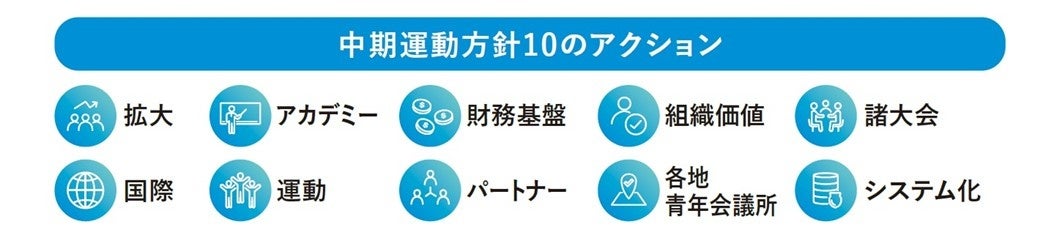組織として5年後にあるべき姿を実現するための手段として、本方針では10のアクションを掲げています。これらは、組織方針を基盤に置き、その中に包括されるかたちで運動に関連する方針が存在している位置づけです。 組織の方向性を明確にしたうえで、それを補完し実現するために事業や運動を展開することが、 青年会議所の持続的な成長につながると考えています。