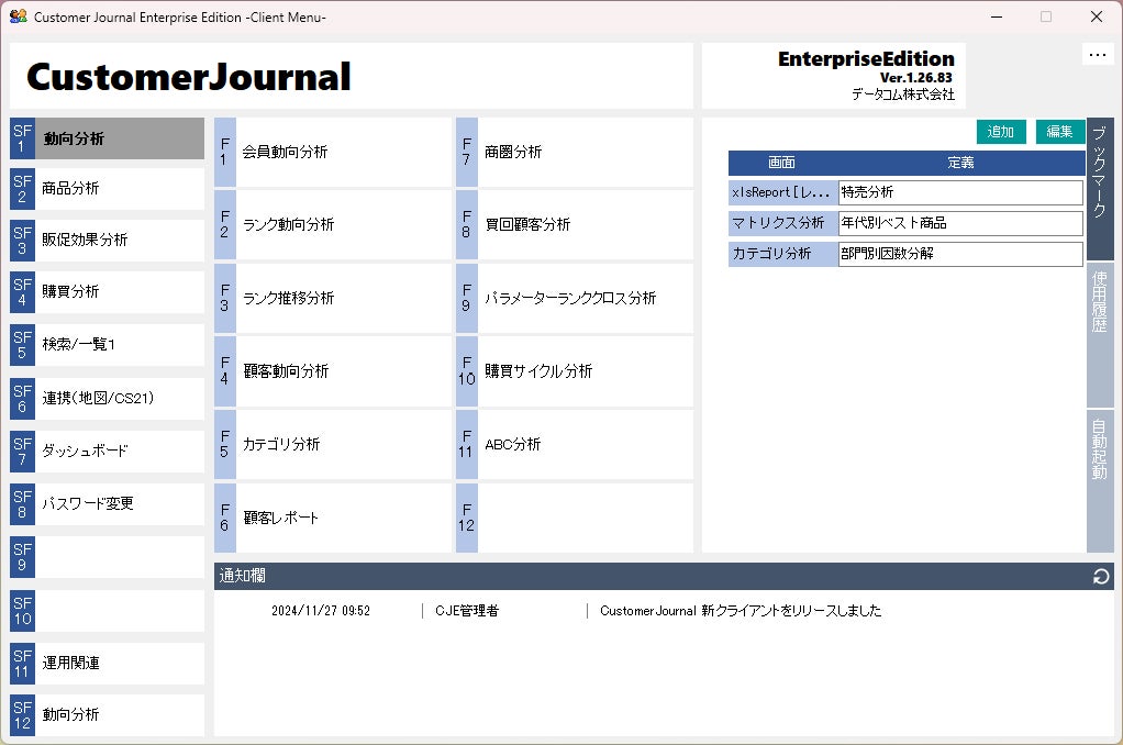 小売業界に特化した商品・顧客分析ソリューションを始めとする、パッケージシステムを開発・提供しているデータコム株式会社(本社:宮城県仙台市、代表取締役:小野寺修一)は、顧客分析システム「Customer Journal」をアップデートしたことをご報告いたします。
