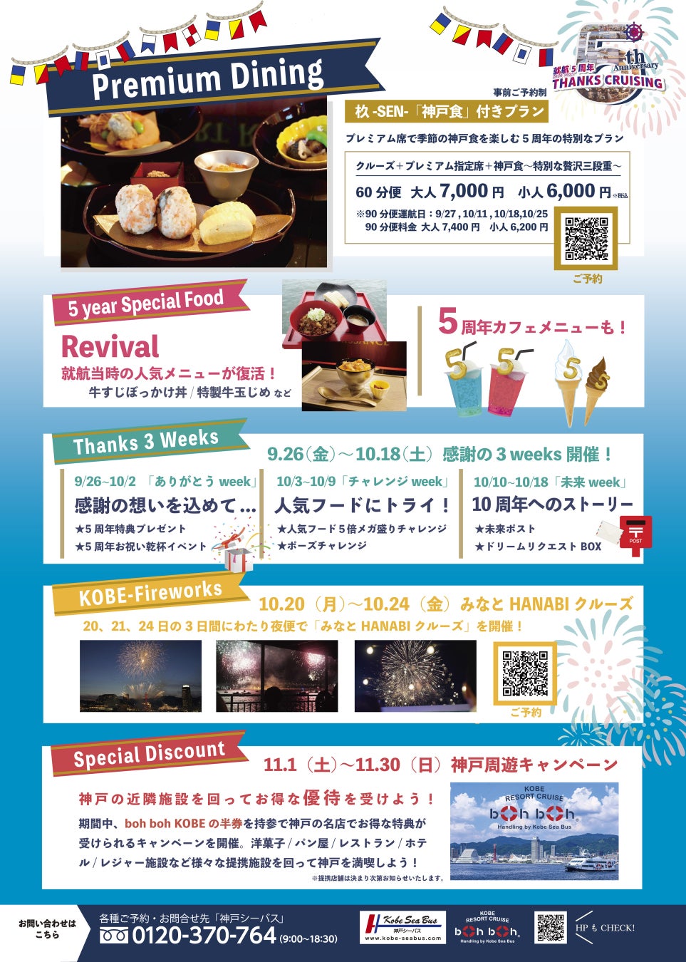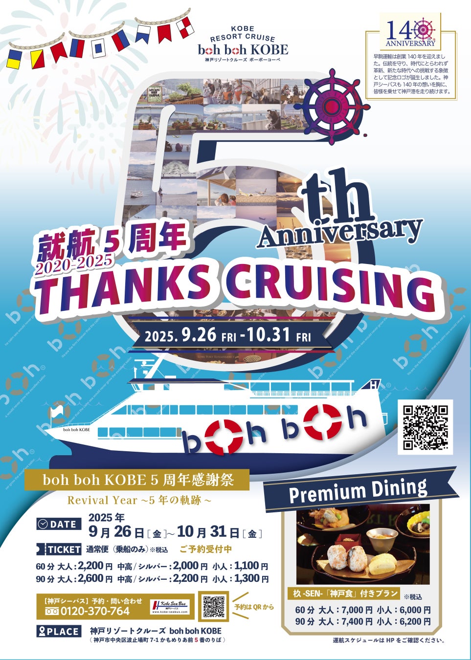 神戸港を拠点に運航する神戸リゾートクルーズ「boh boh KOBE」は、2025年9月20日に就航5周年を迎えます。節目の年を記念し、「THANKS CRUISING」を開催いたします。