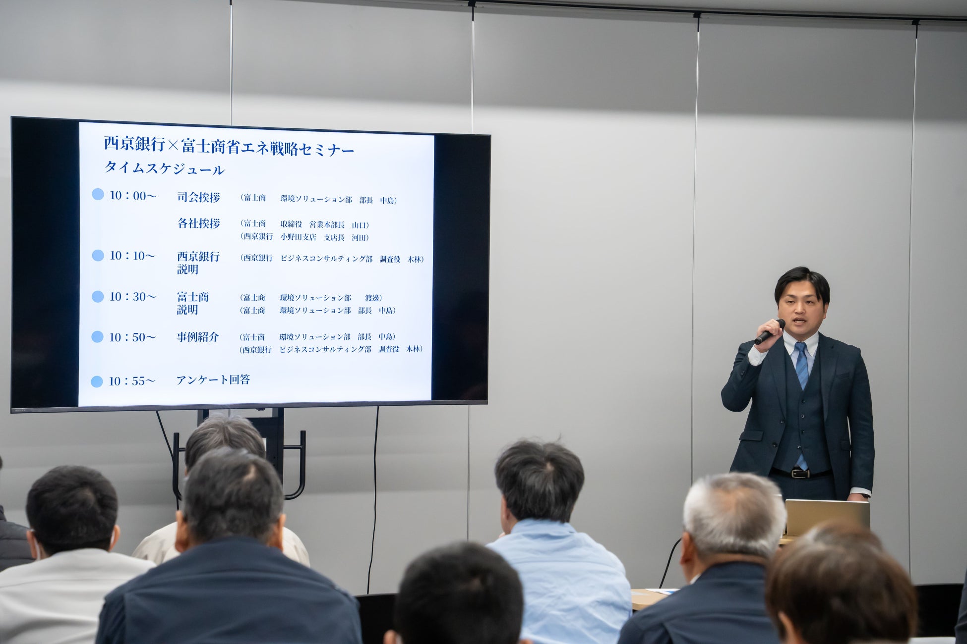 本セミナーの特徴は、金融機関である西京銀行と、エネルギー分野の専門企業である富士商株式会社が連携し、「資金面」と「実行面」の両方から省エネ・脱炭素を支援する点にあります。