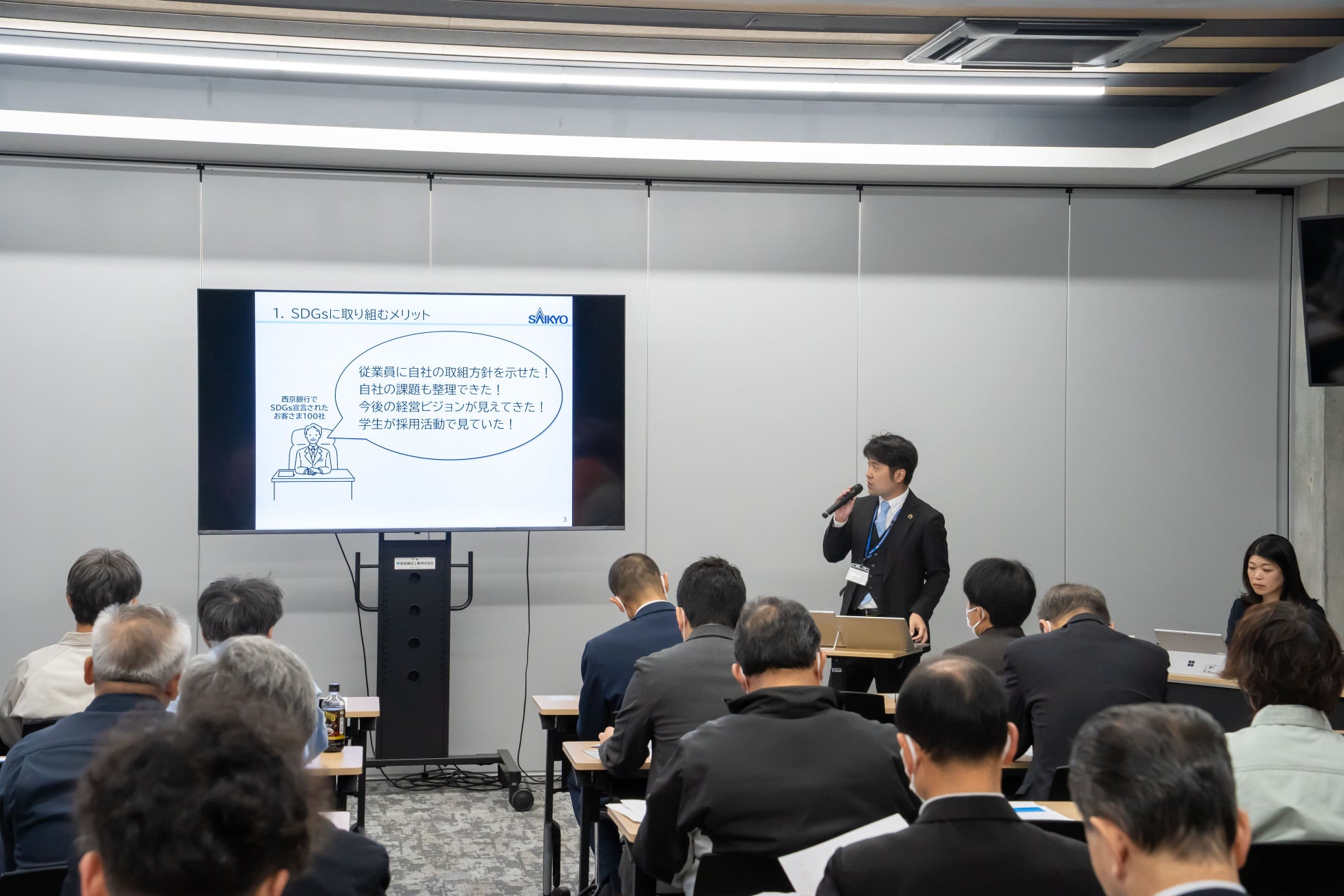 セミナー前半では、西京銀行より、SDGs経営の考え方や、企業価値向上との関係について解説が行われました。