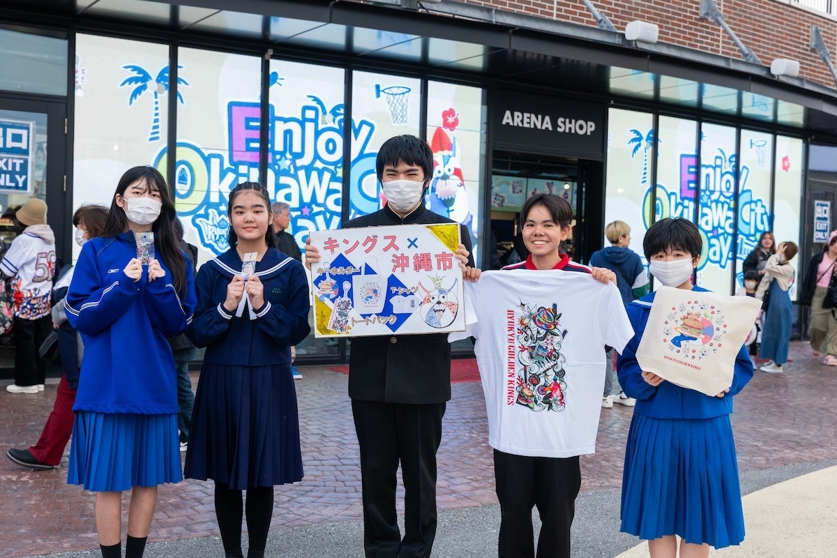 地域の子どもたちの夢と成長を応援する取り組みとして、「キングス×沖縄市 ホームタウンドリームプロジェクト」の一環で、沖縄市立教育研究所に通う中学生と共同製作したオリジナルグッズを販売しました。さらに、試合前日には中学生がアリーナショップで接客体験を行い、成果発表を通じて自信と達成感を感じる場を提供しました。