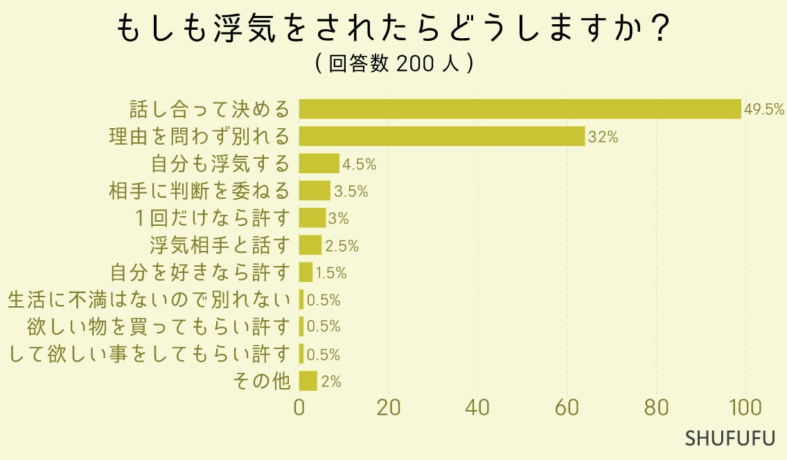 もしも浮気をされたらどうするかを尋ねたところ、1位は「話し合って決める(49.5%)」、2位「理由を問わず別れる(32%)」となりました。半数近くの人が浮気をされたらまずは話をすることを選んだ結果になりました。