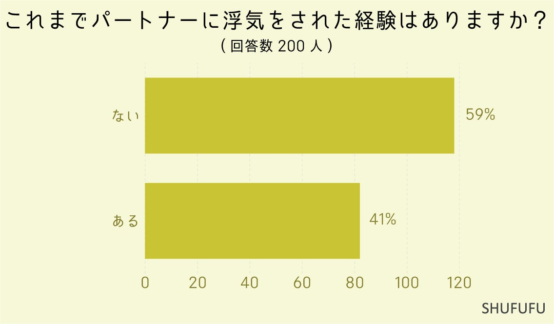 これまでパートナーに浮気をされた経験はありますか?の問いに対して最も多かったのが「ない(59%)」でした。 次いで「ある(41%)」という結果でした。浮気された経験がない人の方が多い結果になりましたが、浮気されたことがある人も結構いますね。