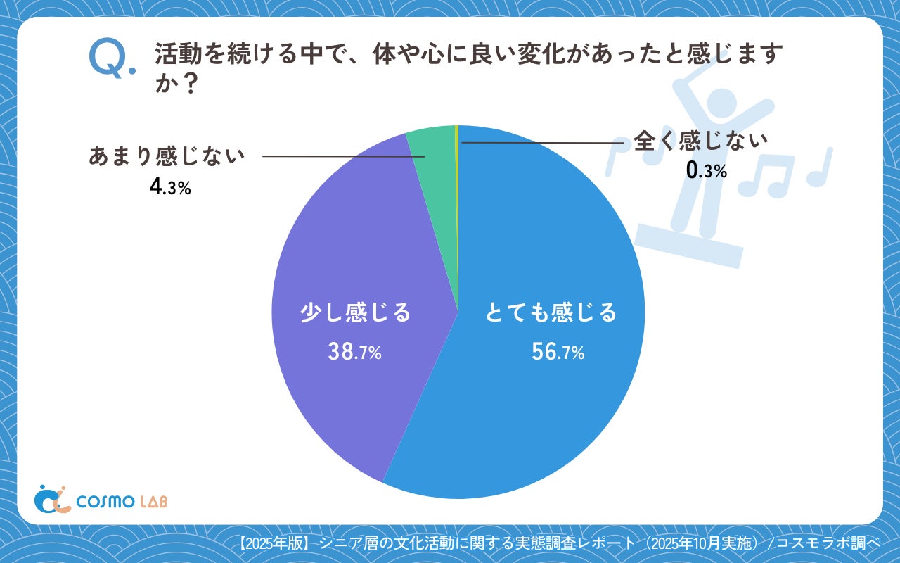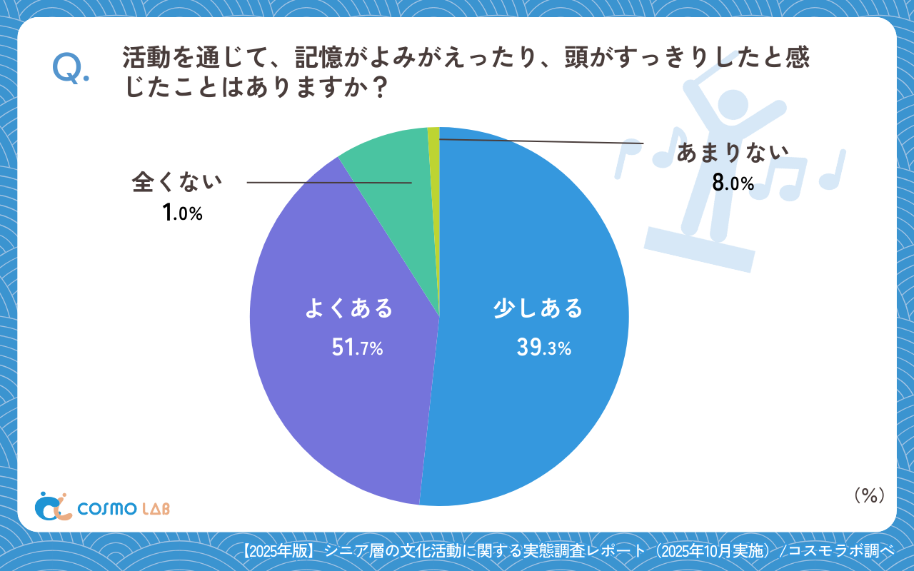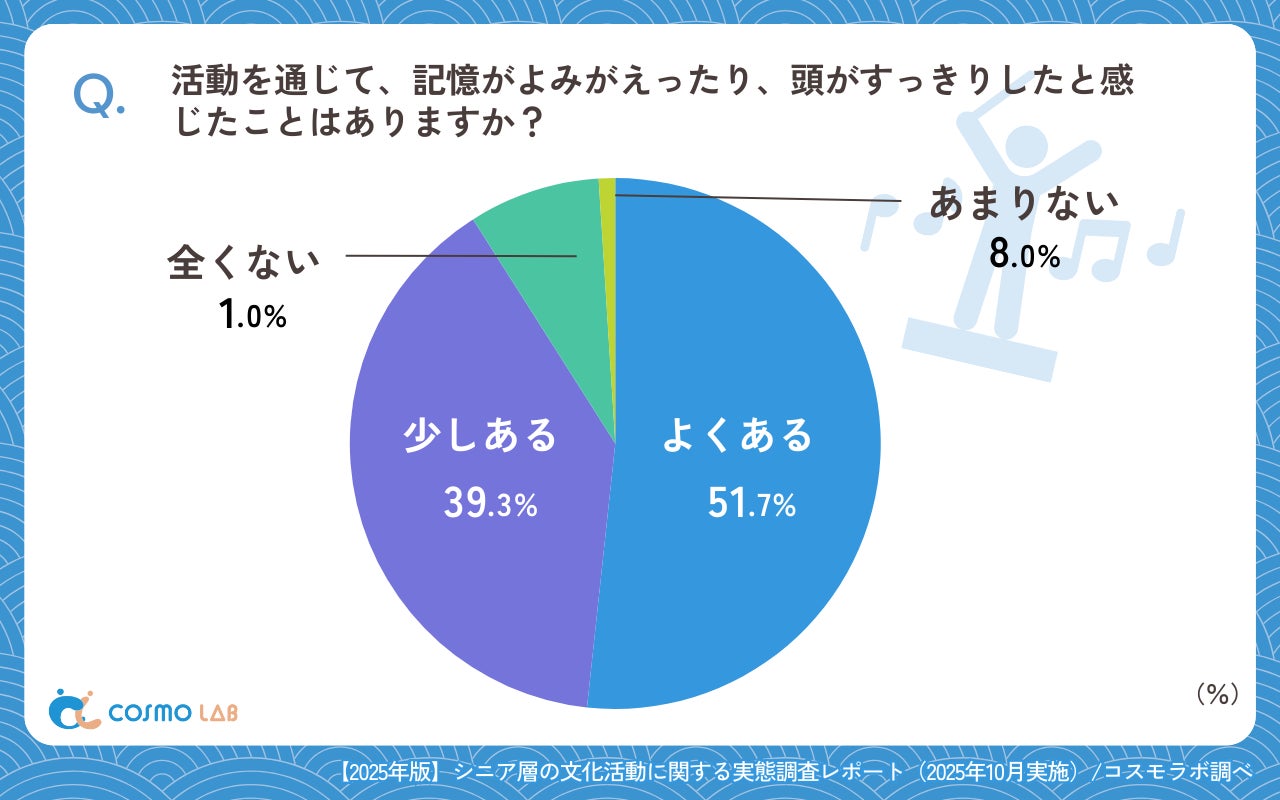 「あまりない」(8.0%)や、「全くない」(1.0%)は少数にとどまり、文化活動が認知面の活性化や気分の切り替えに寄与している姿が浮き彫りになりました。