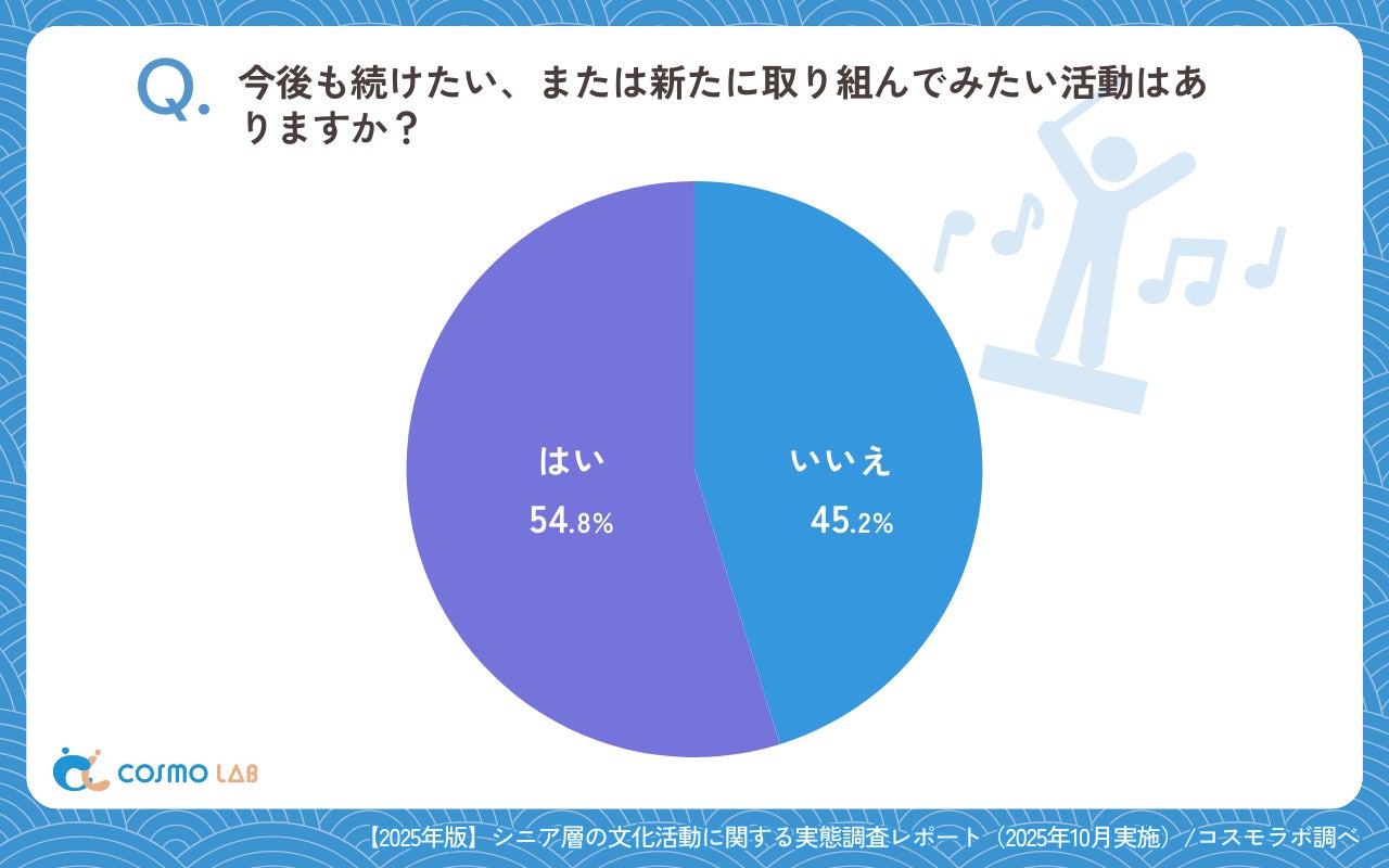 「今後も続けたい、または新たに取り組んでみたい活動はありますか?」では「はい」(54.8%)が「いいえ」(45.2%)を上回り、将来の文化活動に前向きな層が過半数を占めました。