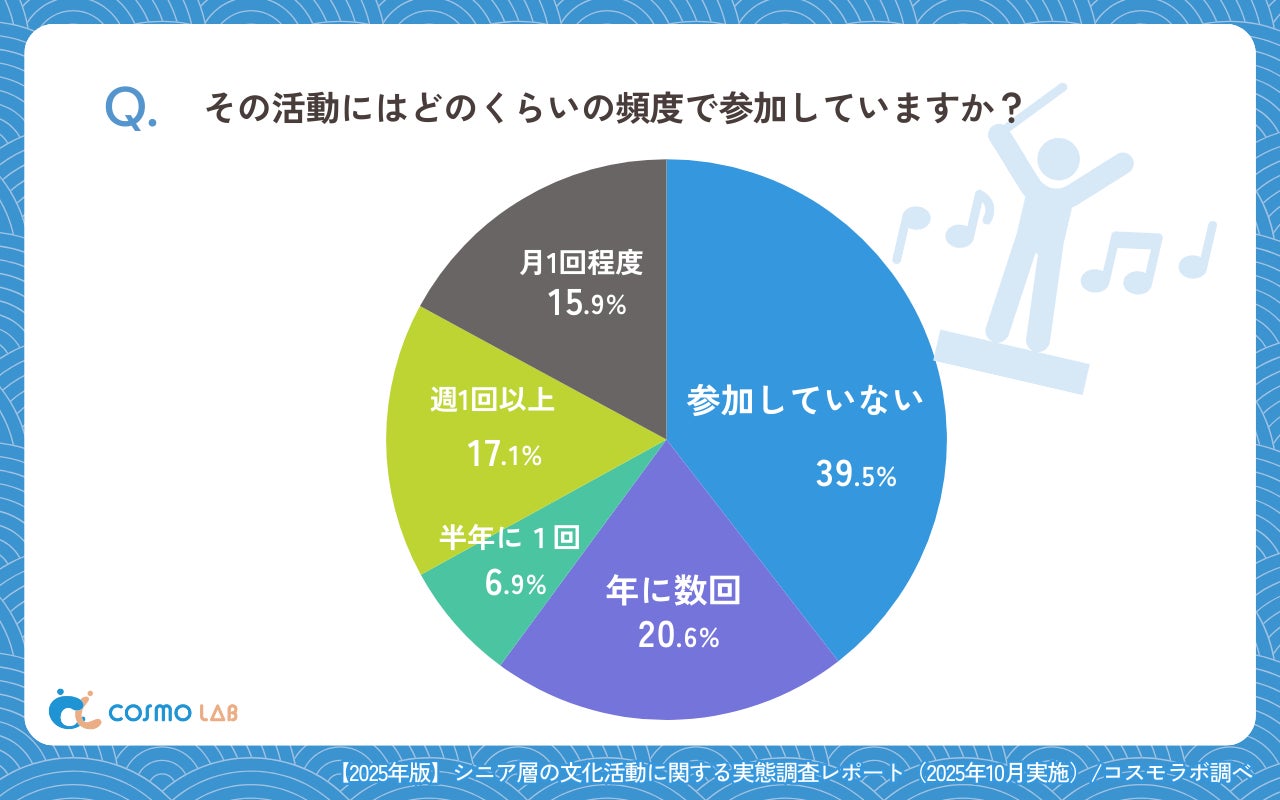 活動頻度を見ても、「参加していない」(39.5%)と、月1回以上・週1回以上の参加者が並存しており、文化活動への関わり方が人によって大きく異なる構造が浮き彫りになりました。