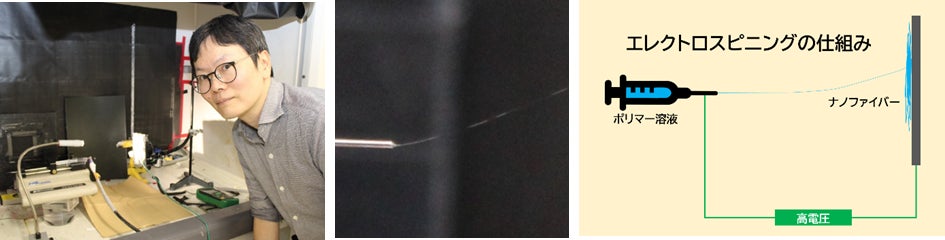 外波准教授は血栓のできない人工血管を作りたいと、直径がナノからマイクロサイズの超極細の糸を使う研究に取り組んでいます。現在はその糸で網目状のマットを作り、形態や加工法の違いによる性能を比較しています。人工血管は動脈硬化の治療などで広く使われています。しかし、表面に血の塊ができることが課題で、塊がはがれて血管が詰まると、心筋梗塞(こうそく)や脳梗塞になるリスクがあります。外波准教授が開発している超極細糸を重ねた人工血管は、治療対象となる血管の内側に留置すると、本来の血管の内側にあり、抗血栓作用を有する内皮細胞が網目をくぐり抜けて人工血管の表面を覆うことで、血が固まらなくなるというものです。