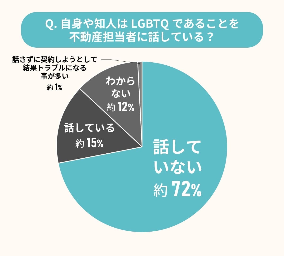 LGBTQであることを不動産担当者に話している人は約15%と、比較的少数でした。ただ、話さずに契約しようとしてトラブルになる事が多いという人も一定数いました。