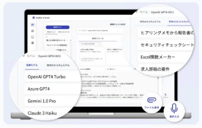生成AI活用プロダクト「Graffer AI Studio」。GPT-4oをはじめとする代表的な生成AIモデルに対応。これまでできなかったExcel/wordのファイル処理や高度なデータ分析など、生成AIの活用を前提とした業務のあり方や、新規事業の開発を検討するにあたって新しいアイデアの実現が可能に。