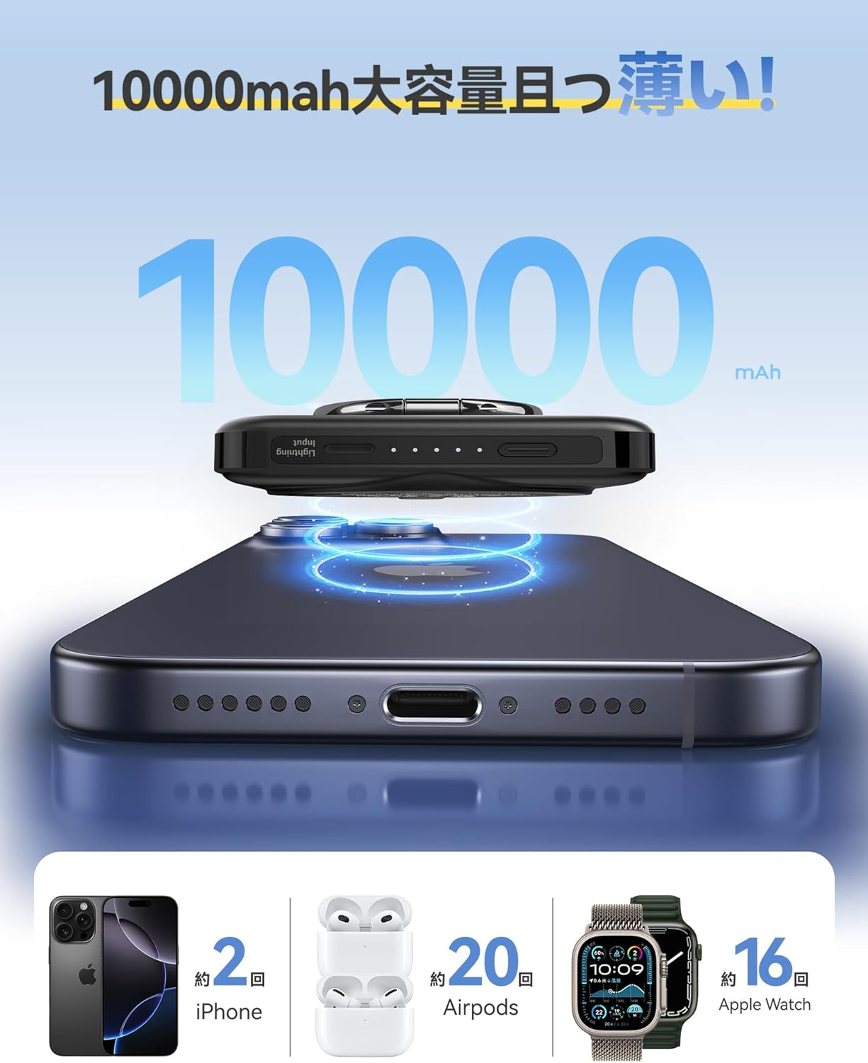 カードサイズの薄さ(厚さ18.8mm)に10,000mAhの大容量を凝縮。iPhone 16を約2回、Apple Watchを約16回、AirPodsを約20回フル充電可能。iPad充電用のUSB-Cポート(20W出力) も装備。