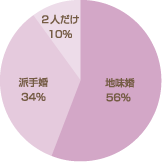 「大掛かりな結婚式にはしない」というカップルが、“地味婚”+“2人だけ”合わせて66%。本当に祝福してくれる方に出席してもらえれば充分、という意見が多いよう。また「彼が派手なことが苦手で・・・」という場合も。そんな2人に人気だったのが海外ウエディングでした。一方「たくさんの友人を呼んで同窓会のように騒ぎたい」というのが“派手婚”派の主張。一生に一度だから、和装、ウエディングドレス、カラードレスを着て、おいしいものを食べながらにぎやかなパーティを、となれば、確かに派手婚になってしまうかも!