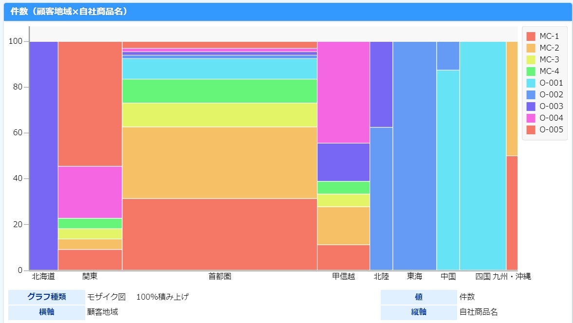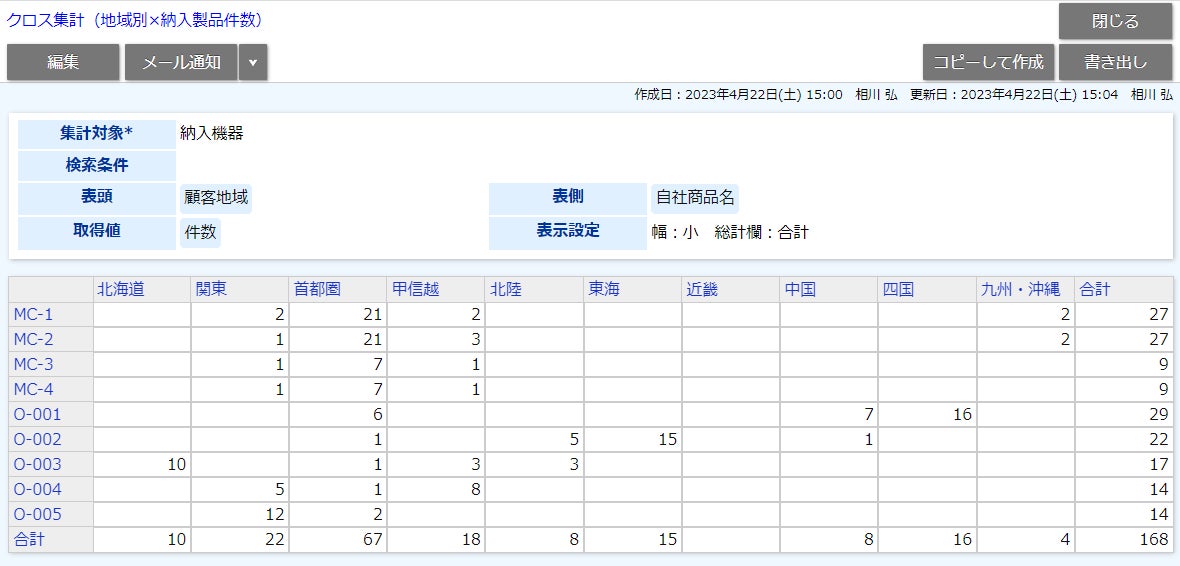 たとえば、新規案件の創出件数を部署別×業種別で集計して営業戦略の実行状況や成果を可視化したり、商品の納入件数を主要顧客別×商品別で集計して拡販余地を可視化するといったことが、直感的な操作で実現できます。