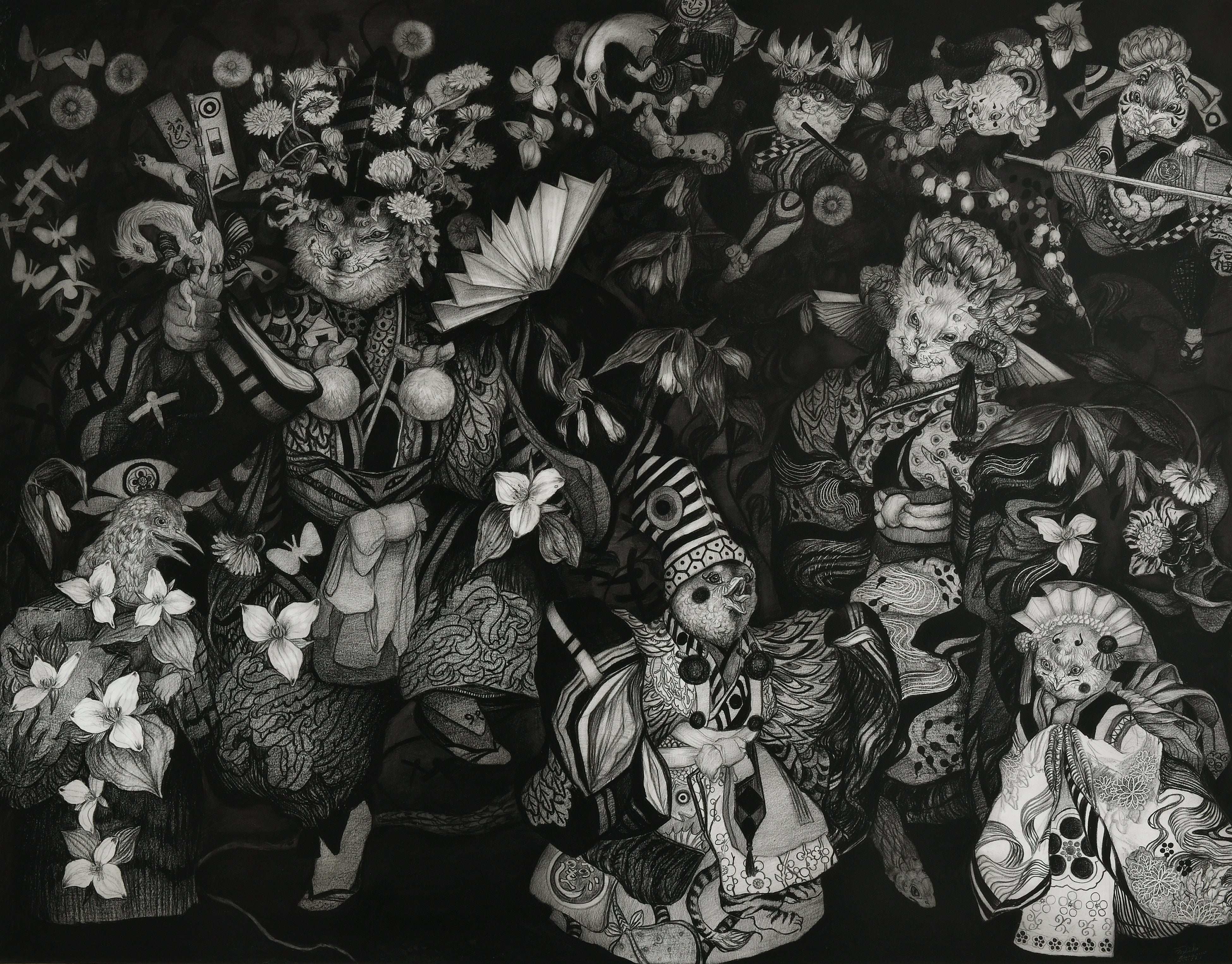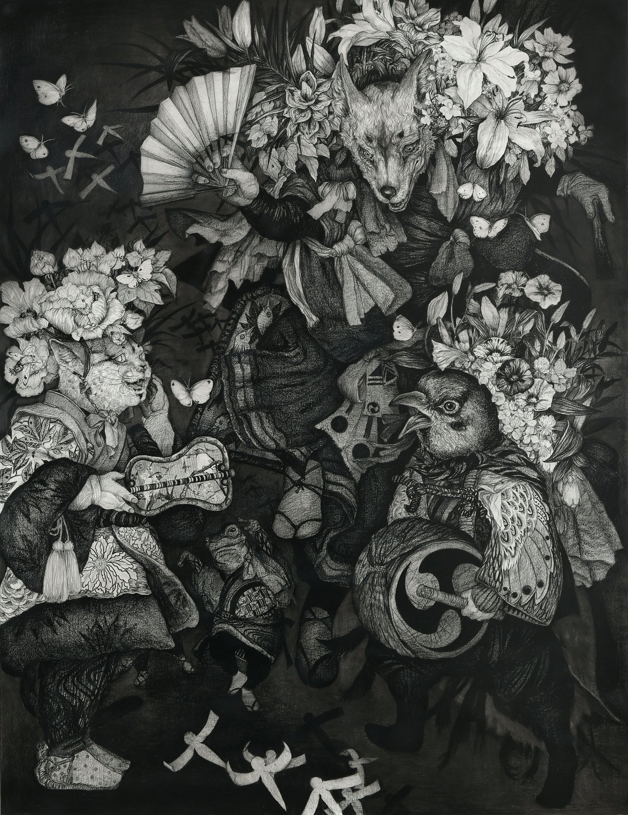 北川は黒色のダーマトグラフ(油性鉛筆)だけを使い、媒体となる白い紙に黒一色でモノクロームの世界を描き続けています。日本の野の草花を背景に、動物たちが画中の主人公として登場。彼らは人間の装束に身を包み、時には歌い踊り、人形劇や合戦の真似事に興じるなど、見る者を愉しく不思議な黒の世界へと誘います。耳を澄ますと聞こえてきそうな動物たちの囁き声。画面の上ではしゃぐ生き物たちは何を語りかけてくるのでしょうか。