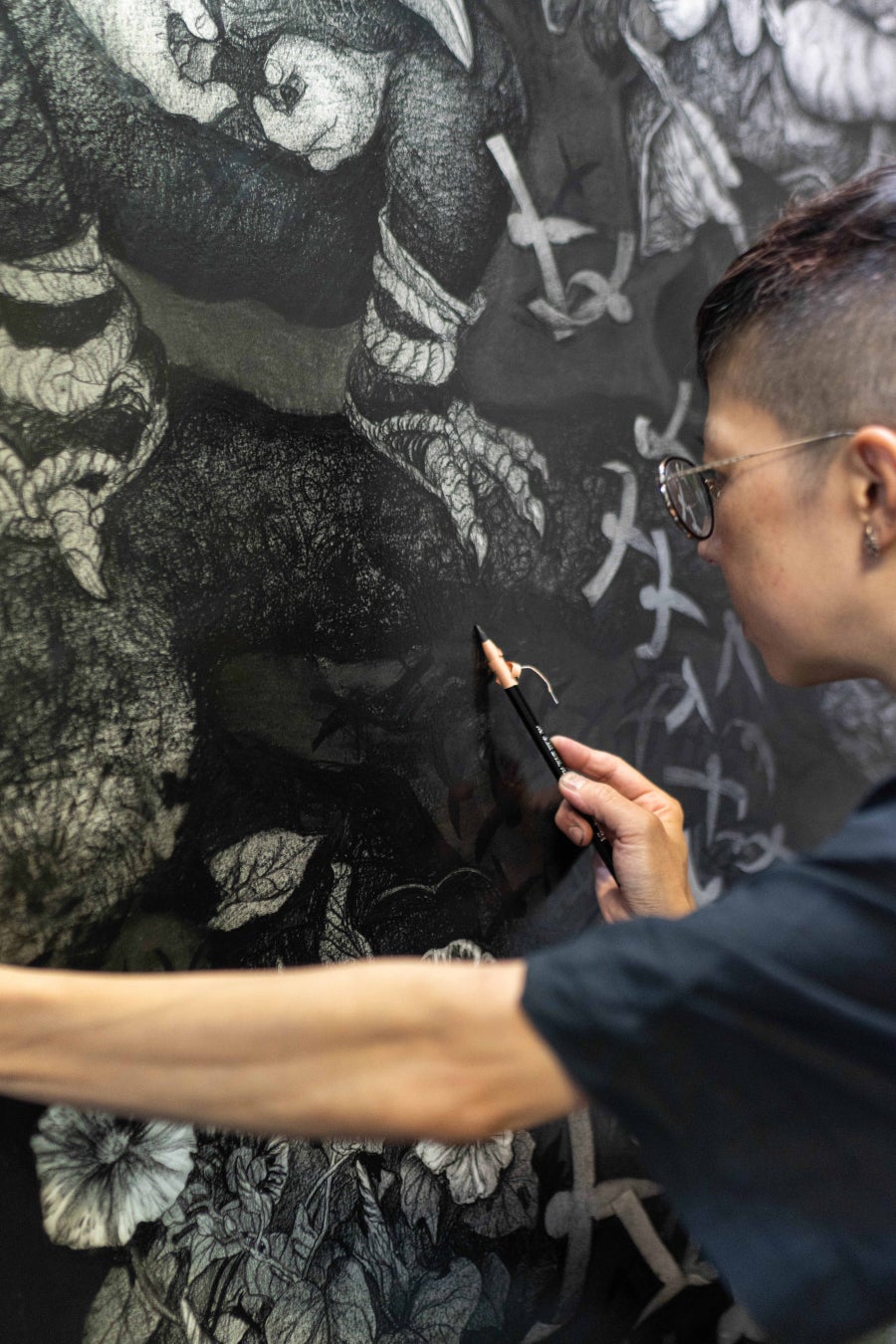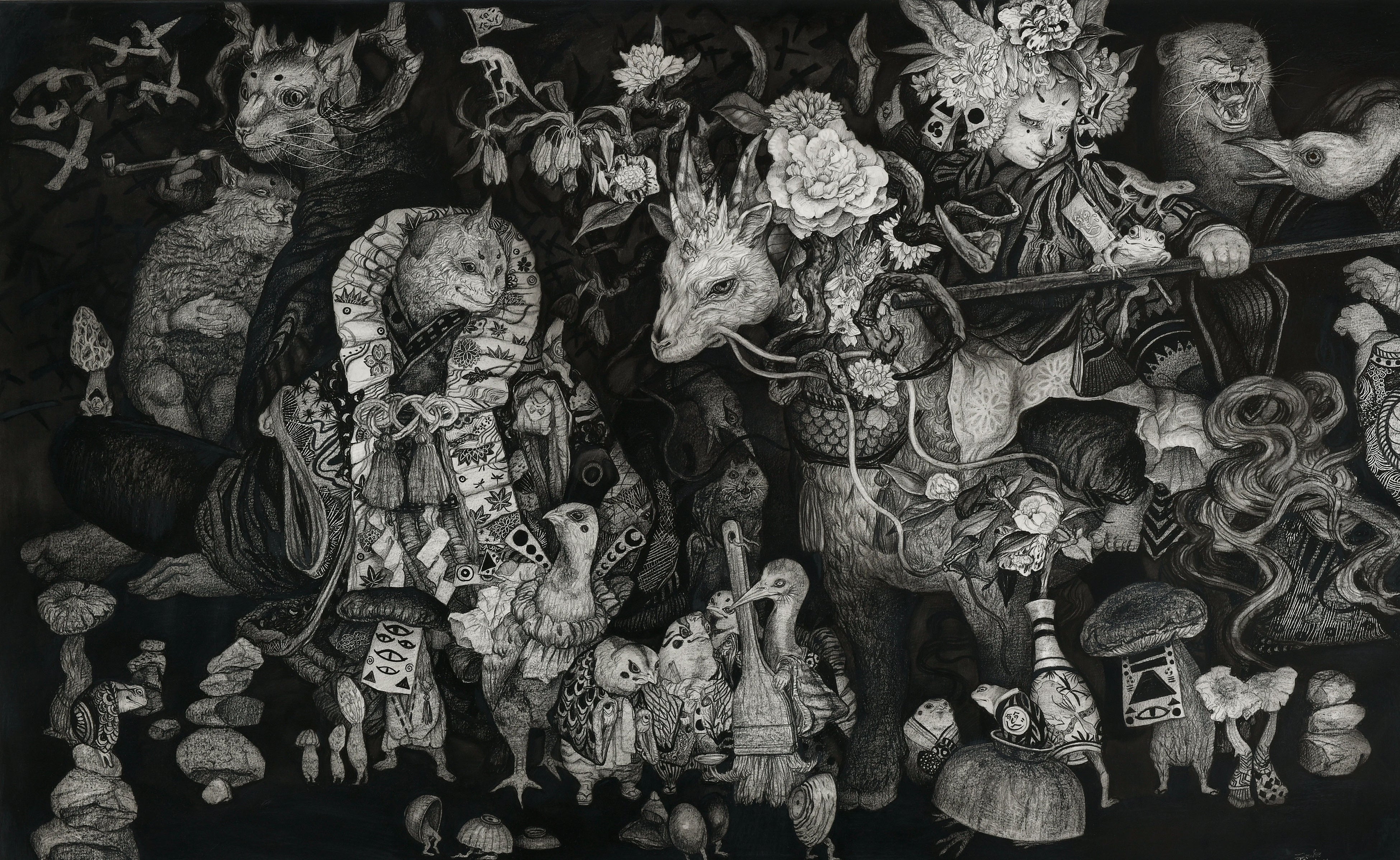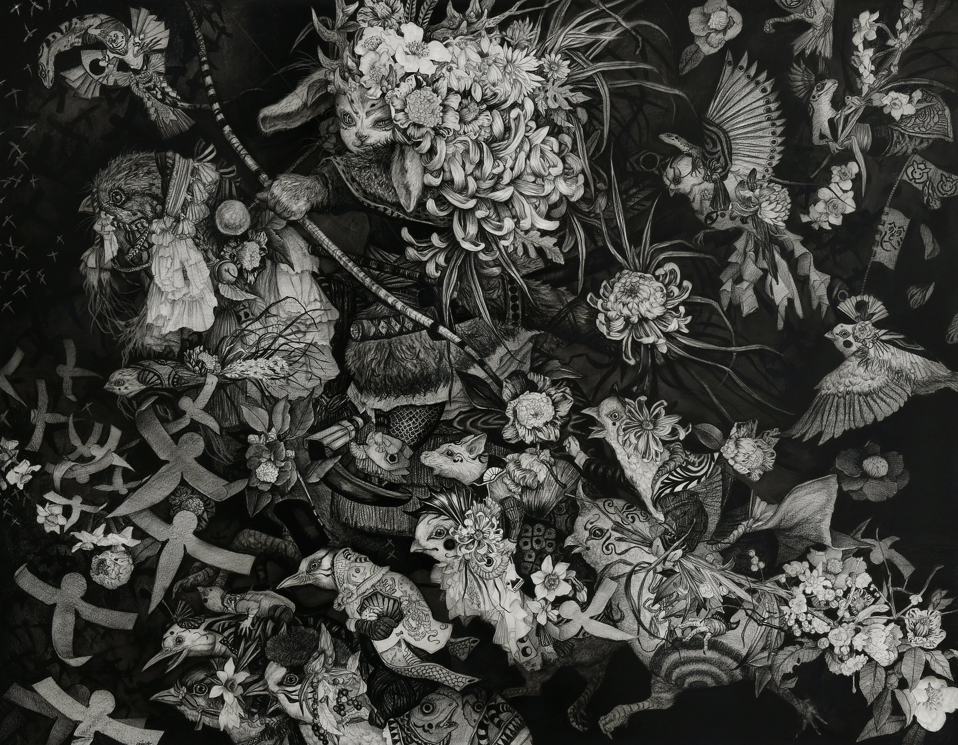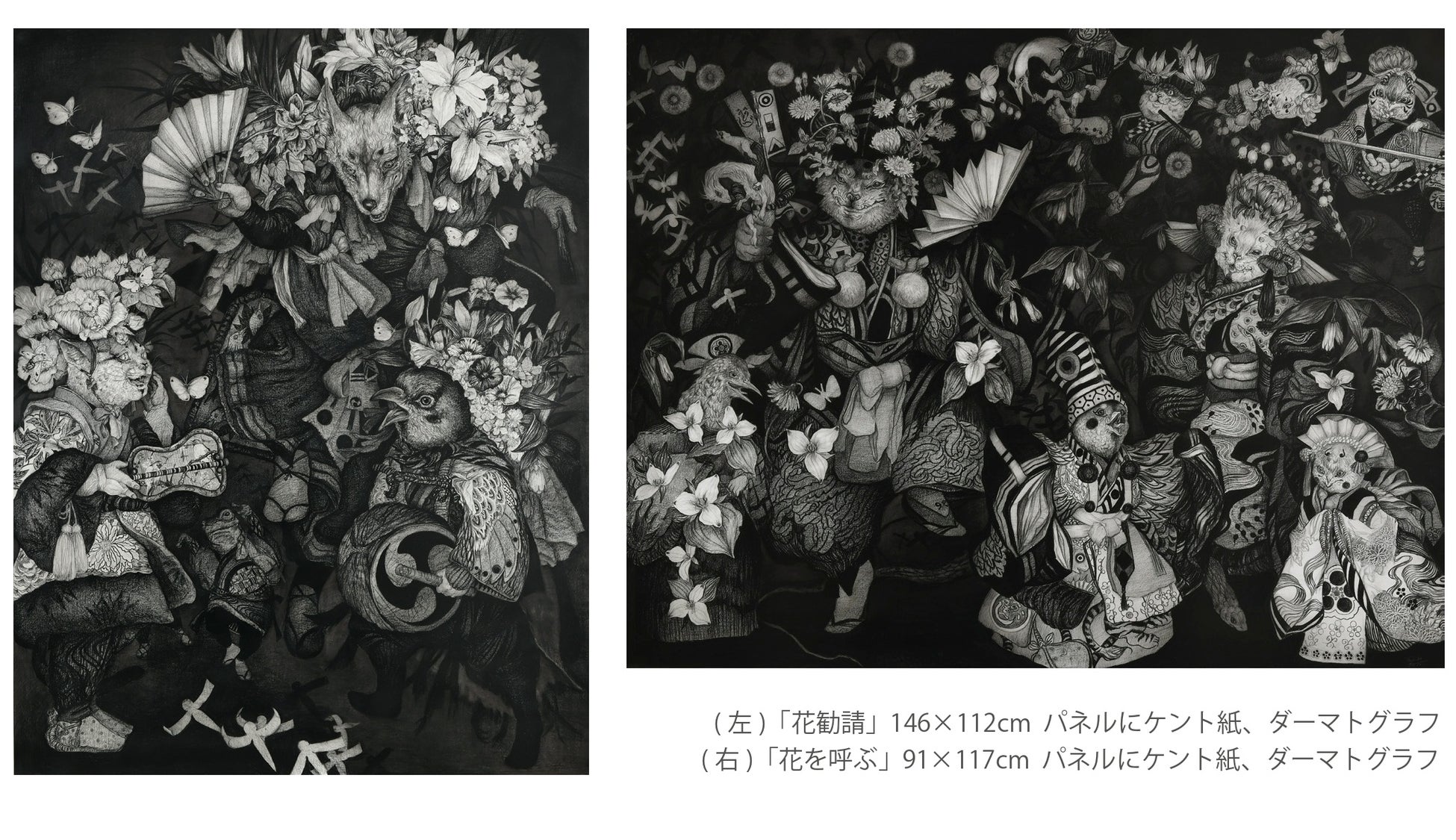 北川にとって黒や闇は「好奇心や想像を掻き立てる入り口」です。黒の世界で記憶の欠片が想像と結びつき、変幻自在に現れる輪郭を追いかけていくと、ふと画面に花が咲く瞬間があるといいます。花がきっかけとなり、生き物たちがその姿を現し、幻想世界が展開してゆく。個展タイトル「花勧請」にはその花の訪れを願い、祝う作家の想いが込められています。