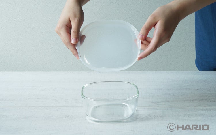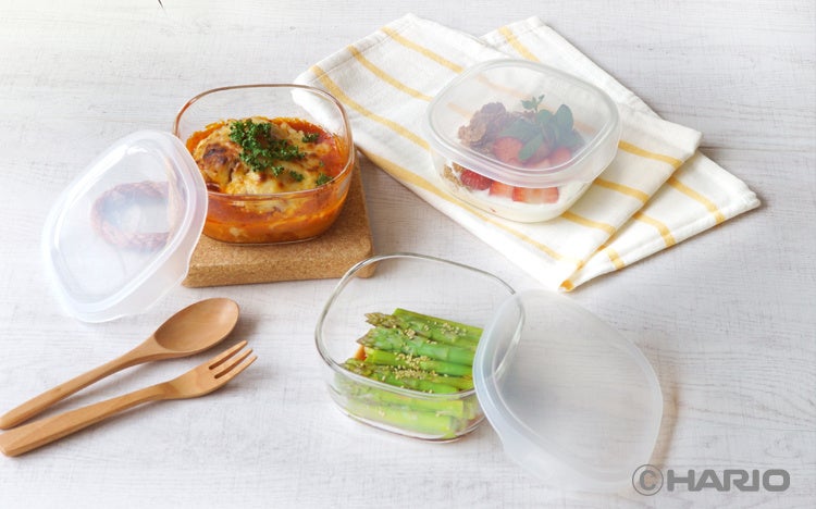 「耐熱ガラス性保存容器・角」は、2018年から発売。現在は、サイズやカラーのバリエーションを増やし、14アイテムを発売中。本体の耐熱ガラス「HARIO Glass®」は、天然素材を用いて、HARIOの国内工場で生産、フタも日本製です。